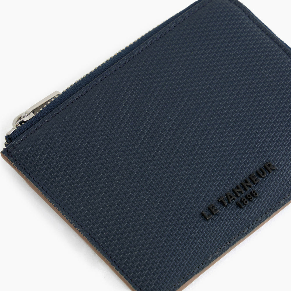 Porte-cartes moyen avec zip finition canon de fusil et marquage Le Tanneur en lettre métal noires mat.Cuir de vachette grain T. Doublure textile jacquard.3 poches plates, 1 poche ID, 1 poche monnaie rabat, 2 poches billets et 6 compartiments cartes.Accessoires métalliques finition canon de fusil.Largeur : 12 cm x Hauteur : 9 cm