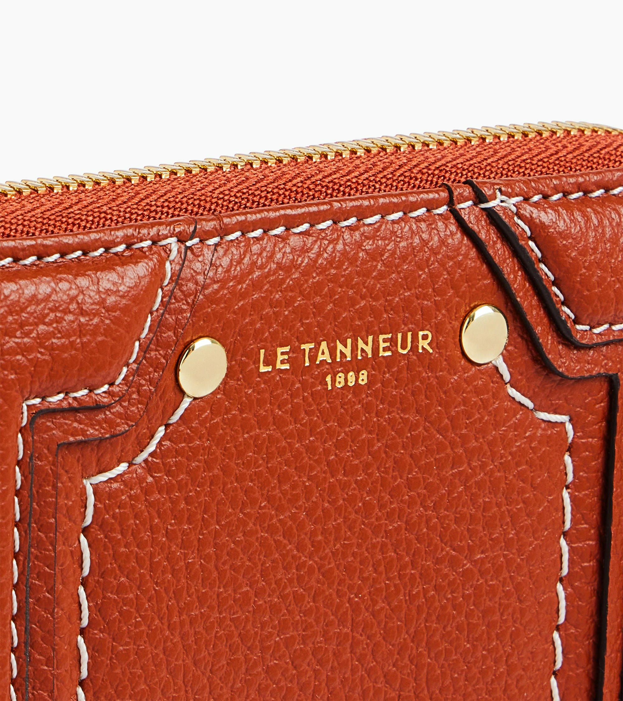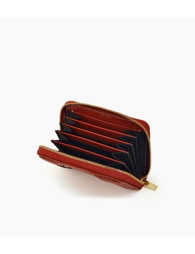 Dimensions compactes, cuir grainé pleine fleur, fermeture zippée métal, plusieurs emplacements pour cartes et un compartiment pour monnaie.