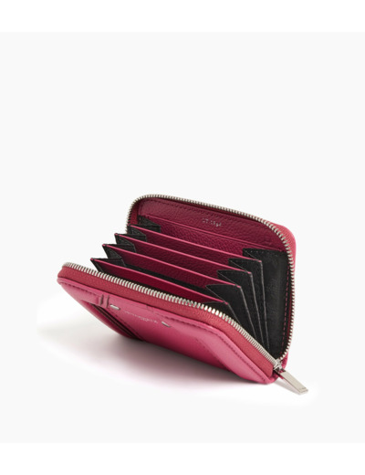 Dimensions compactes, cuir grainé pleine fleur, fermeture zippée métal, plusieurs emplacements pour cartes et un compartiment pour monnaie.