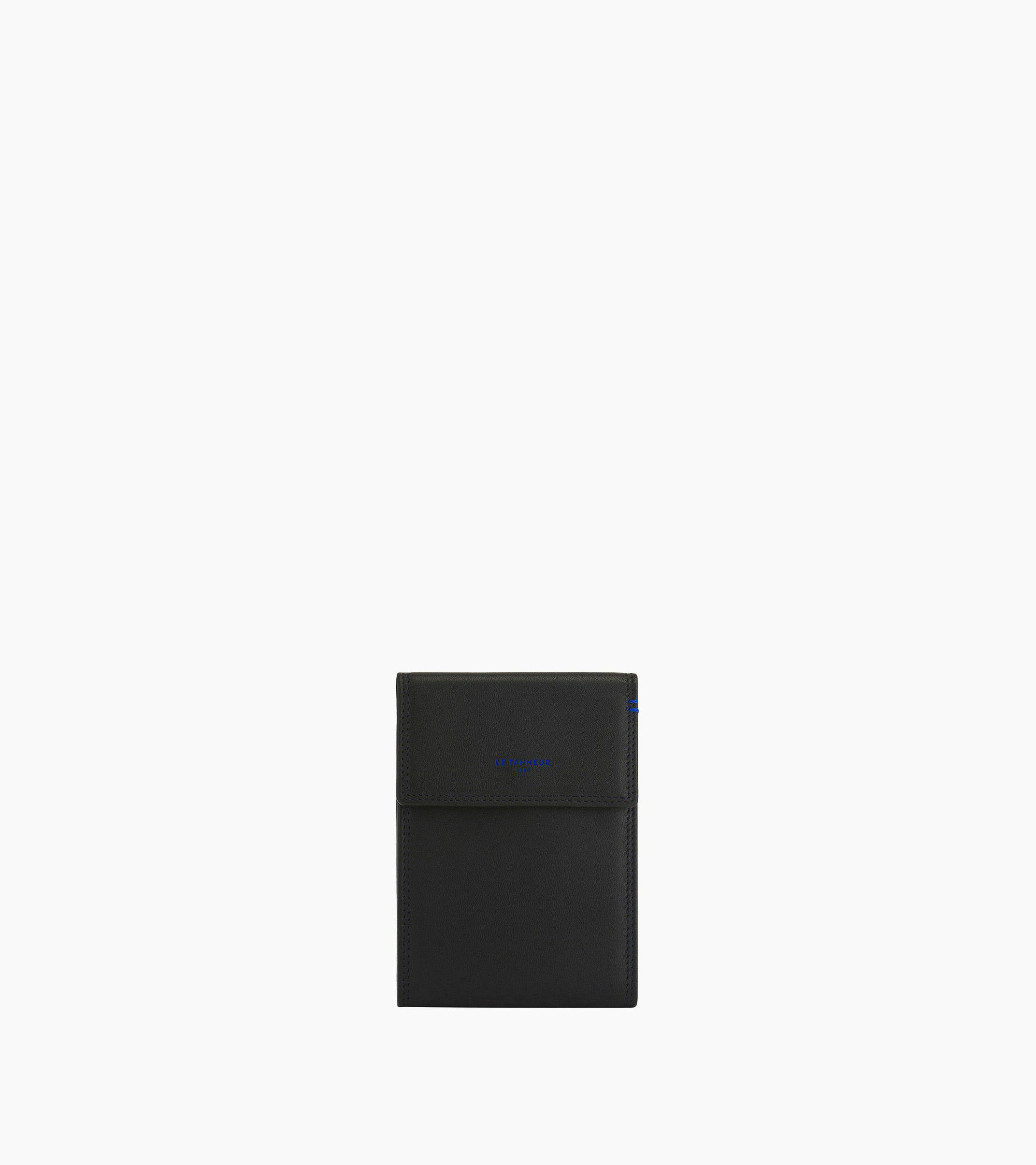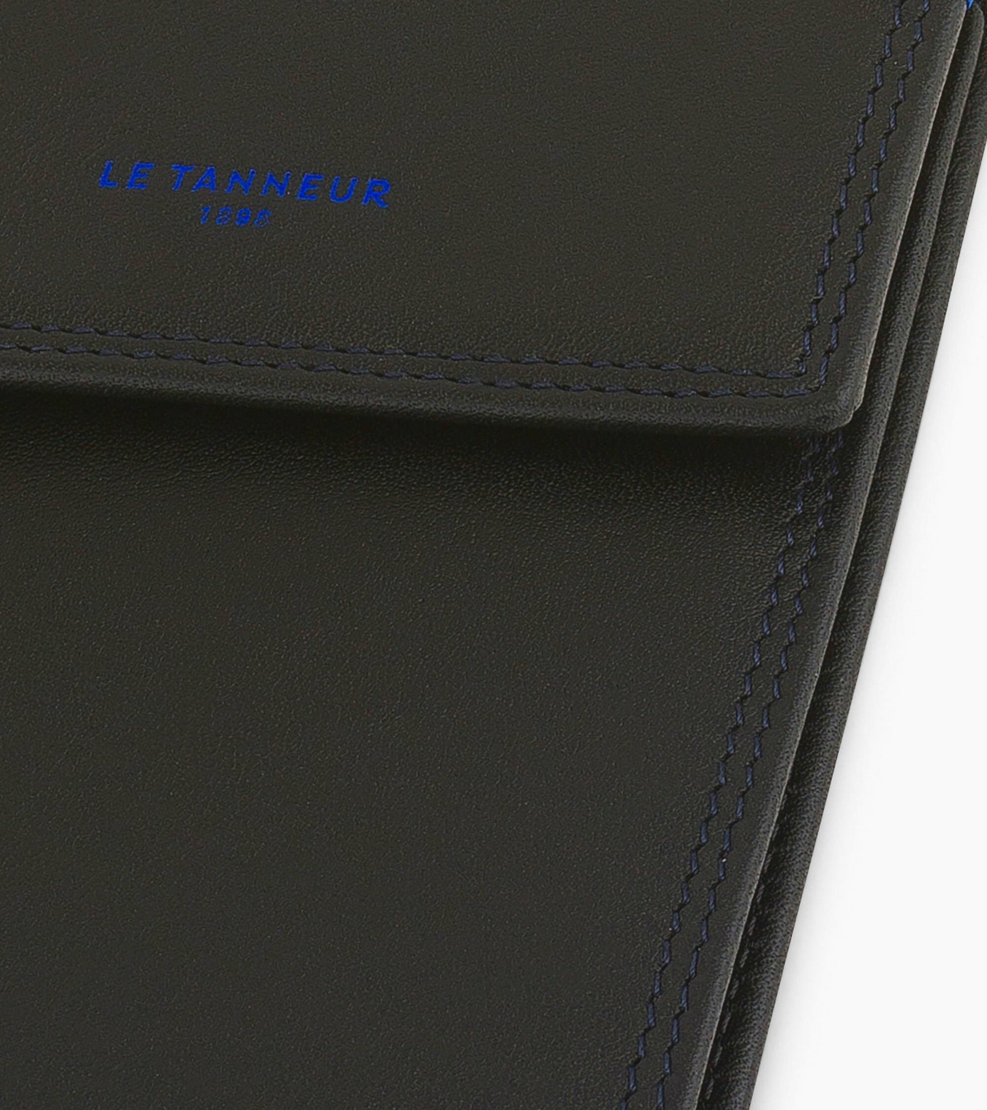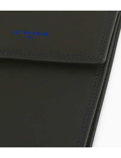 Dimensions compactes, cuir lisse pleine fleur, coutures renforcées, fermeture sécurisée par pliage. Plusieurs compartiments internes pour chéquier, cartes et documents. Fabrication française signée Le Tanneur.