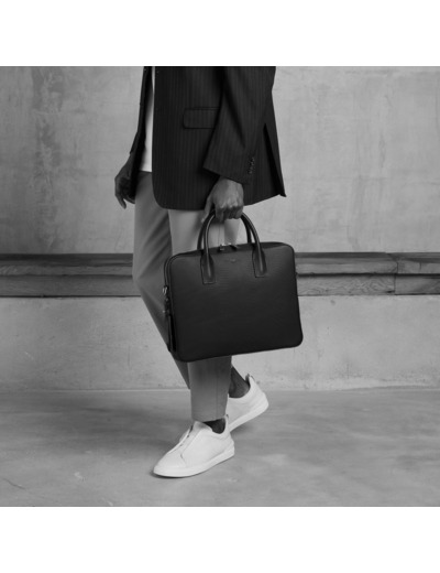 Fabriqué en cuir pleine fleur, il mesure environ 36 cm de largeur, 27 cm de hauteur et 4 cm d’épaisseur. Il dispose d’une fermeture zippée sécurisée, d’une poignée renforcée et d’une bandoulière amovible pour un port main ou épaule. L’intérieur est doublé de textile résistant, avec plusieurs poches plates pour optimiser le rangement.