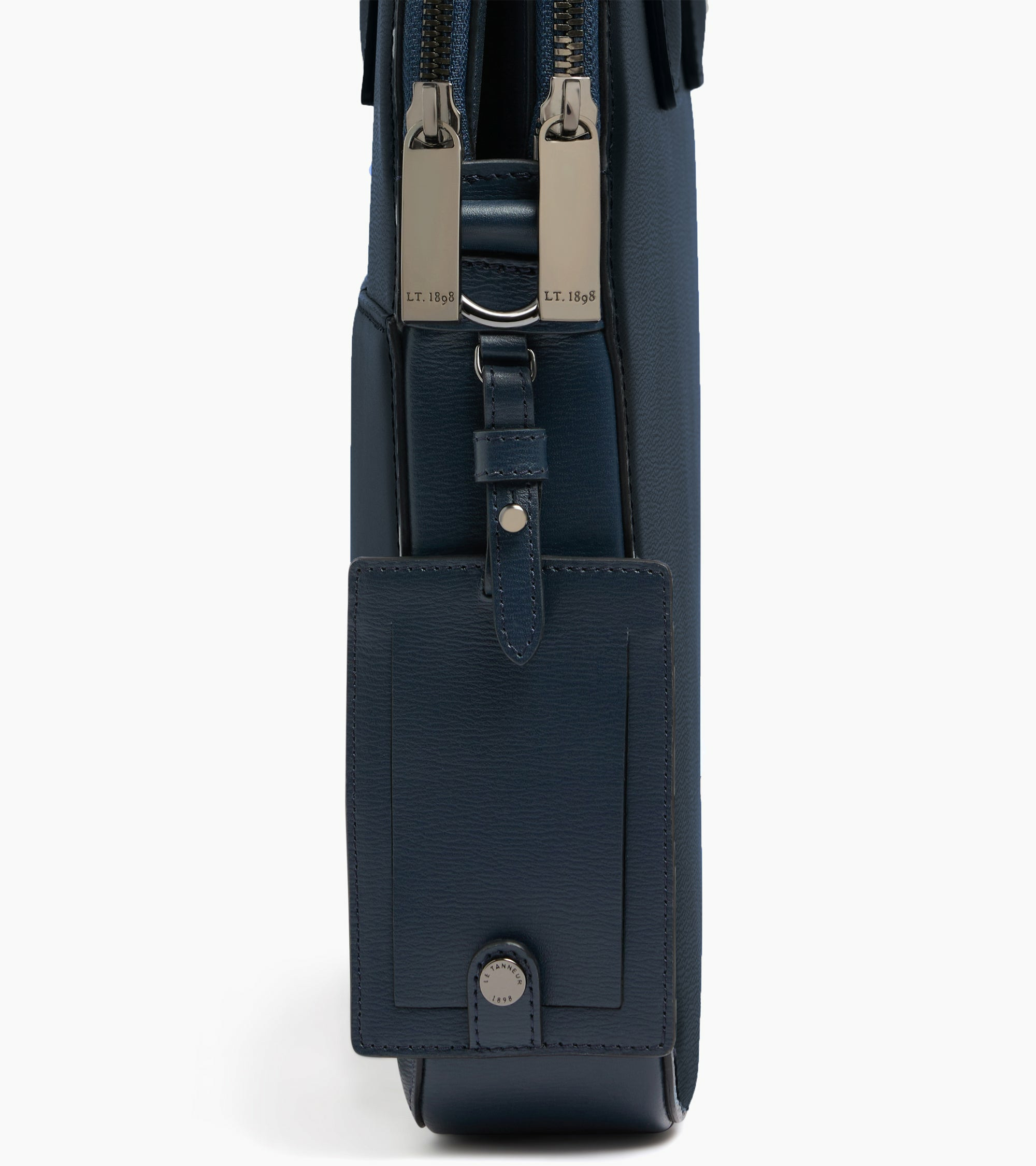Porte-documents avec fermeture double zip, passant trolley et porte-étiquette amovible. Porté main, croisé ou épaule grâce à sa bandoulière ajustable amovible. Peut accueillir un ordinateur portable 15”.Cuir de vachette pleine fleur liégé. Doublure textile jacquard.1 poche zippée moussée ordinateur, 2 poches zippées, 1 poche plate et 1 passant trolley. Bandoulière ajustable et amovible.Accessoires métalliques finition canon de fusil.Largeur : 40 cm x Hauteur : 30 cm x Profondeur : 5 cm