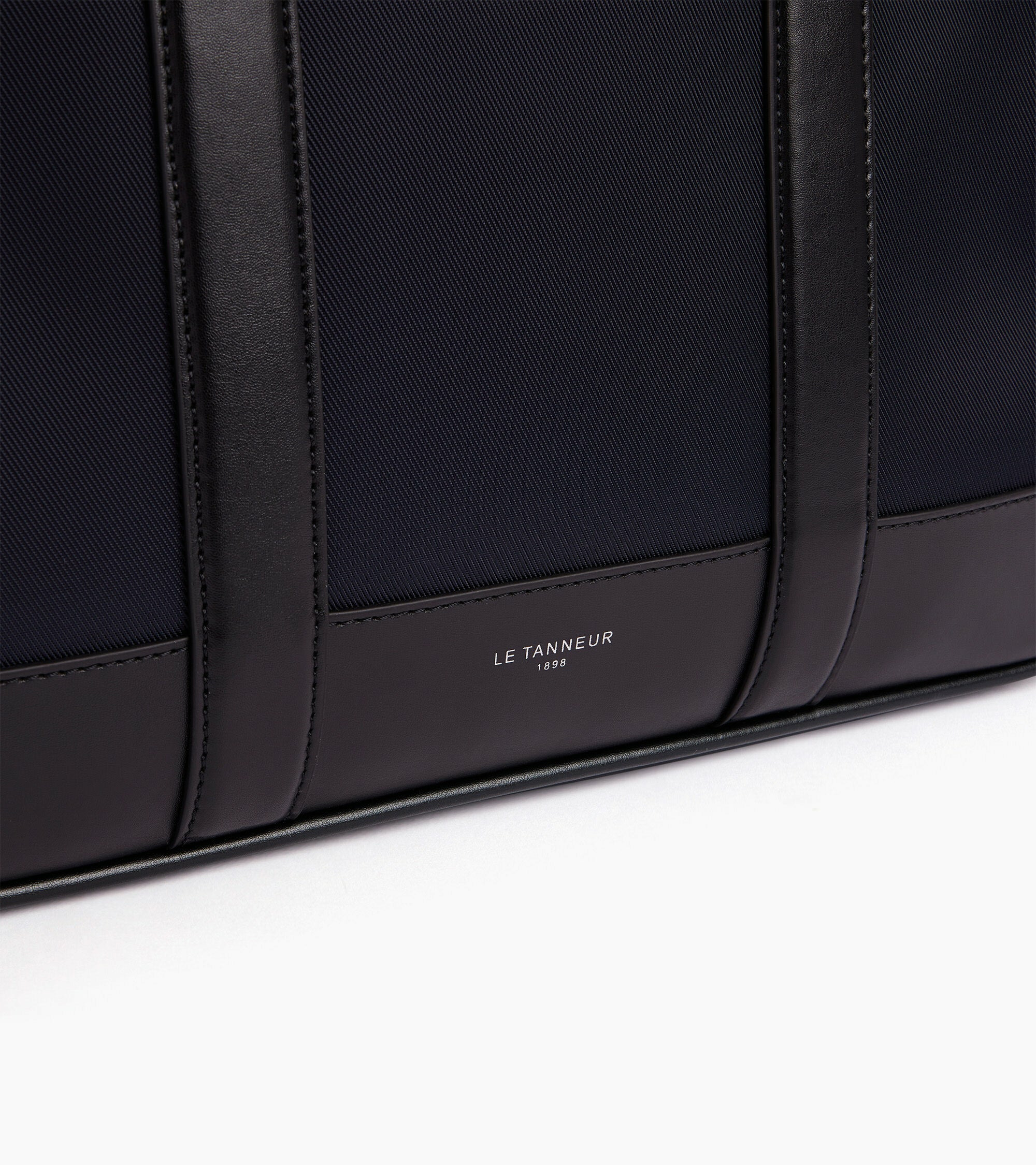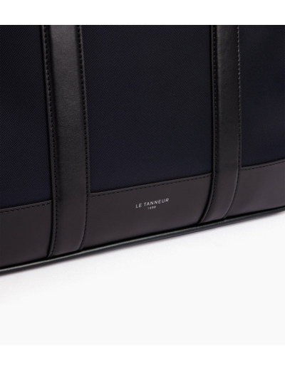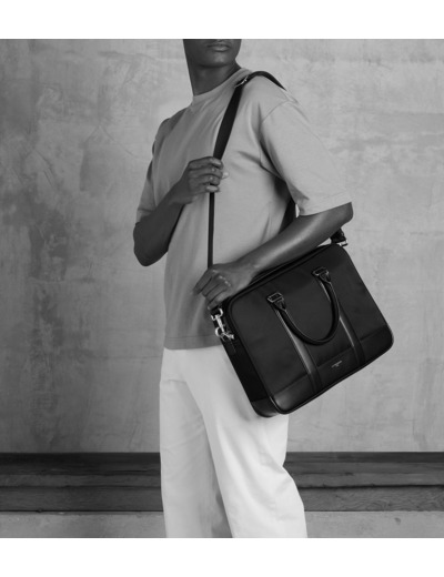 Porte-documents en toile polyamide avec renfort cuir. Bandes ajustées piquées en T, signature de la Maison. Portez-le à la main, croisé ou à l’épaule avec sa bandoulière amovible. Peut accueillir un ordinateur portable 15”.Toile enduite et cuir de vachette lisse. Doublure textile.2 poches plates et 1 poche moussée ordinateur. 1 poche zippée avant. Passant trolley. Bandoulière amovible et ajustable.Accessoire métallique finition argent.Largeur : 38 cm x Hauteur : 30 cm x Profondeur : 7 cm