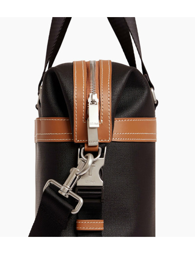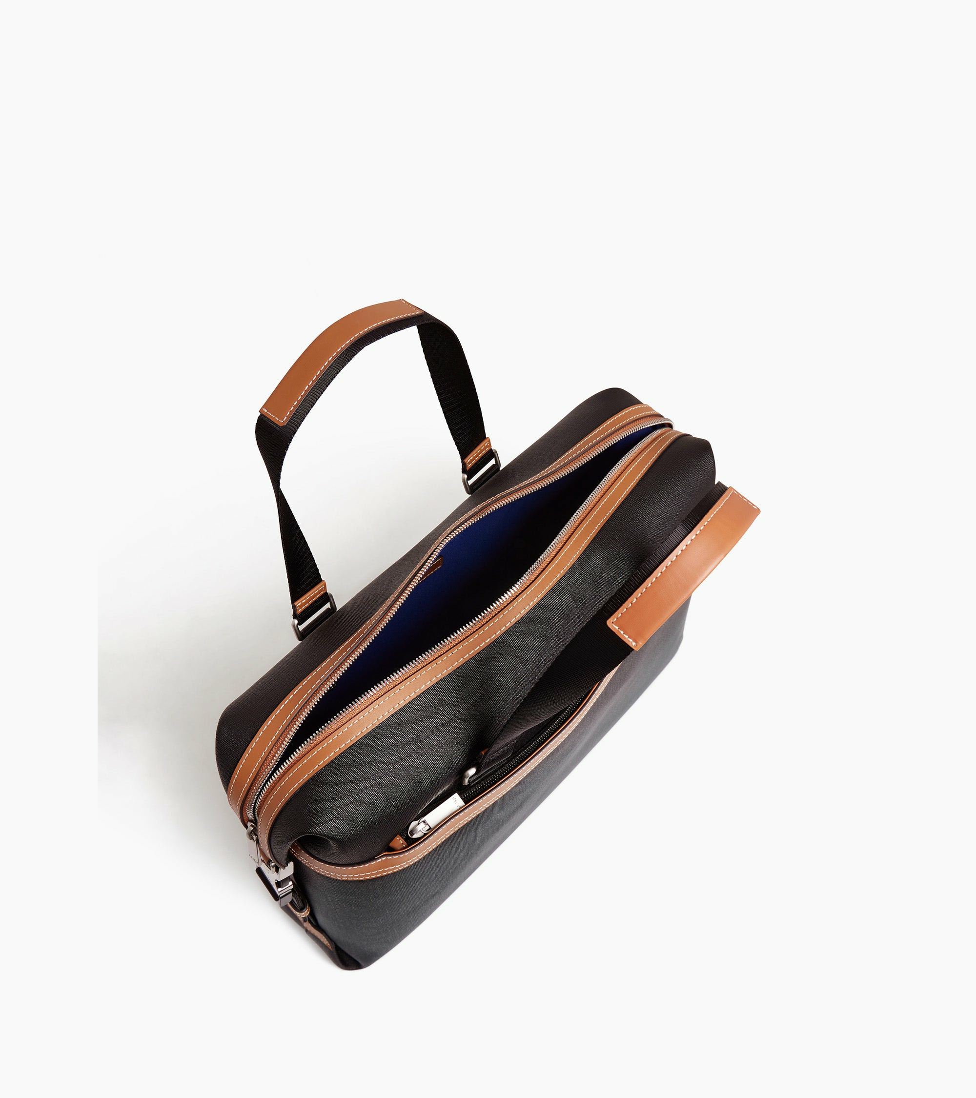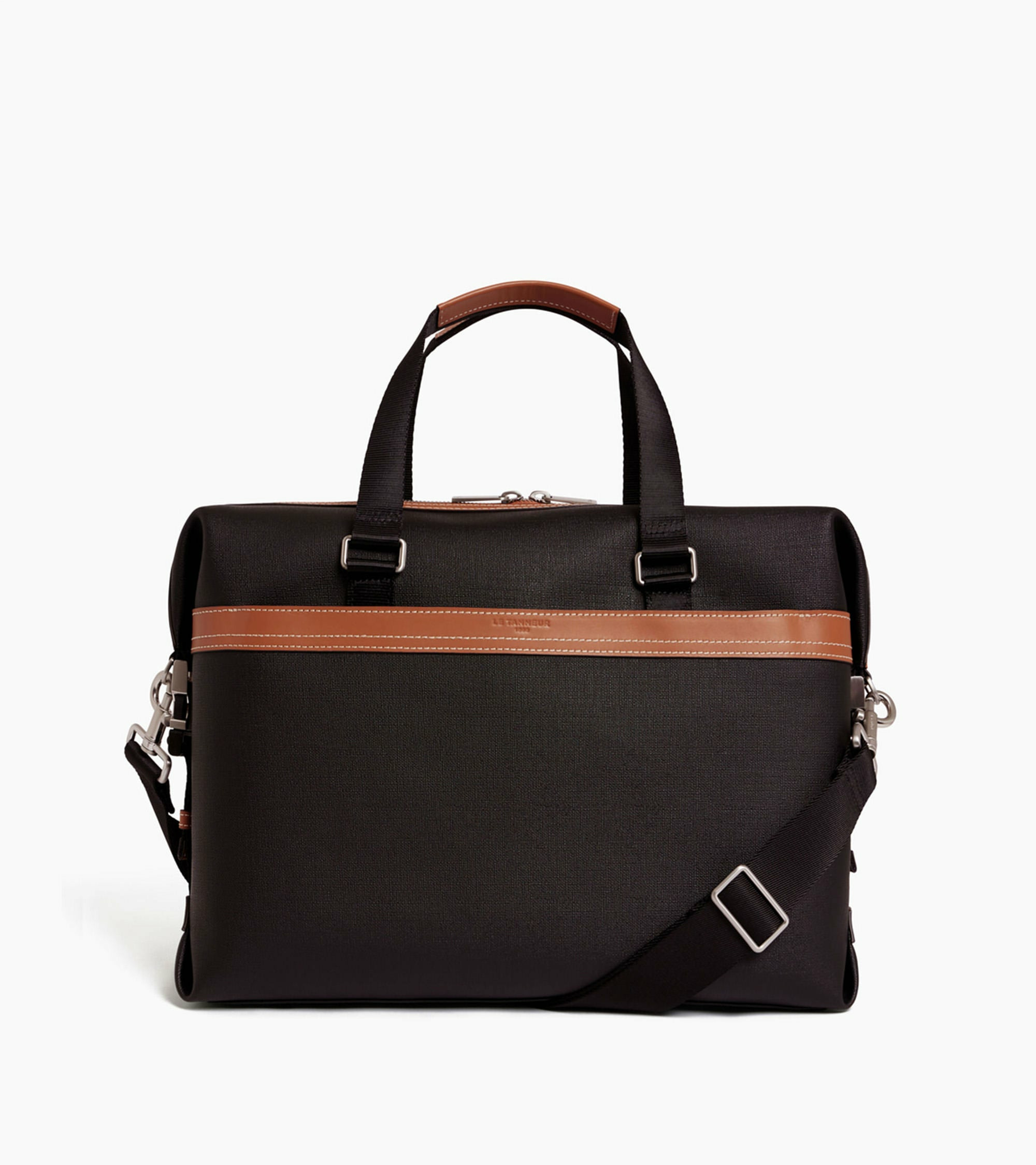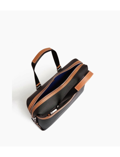 Porte-documents avec empiècement cuir embossé Le Tanneur et éléments métalliques finition argent brossé. Porté main, épaule ou croisé grâce à sa bandoulière ajustable et amovible.Toile enduite grainée et cuir de vachette pleine fleur lisse. Doublure textile Le Bleu.1 poche zippée et 1 poche moussée ordinateur. 1 poche zippée extérieure. Bandoulière amovible et ajustable.Accessoires métalliques finition argent brossé.Largeur : 40 cm x Hauteur : 10 cm x Profondeur : 29 cm