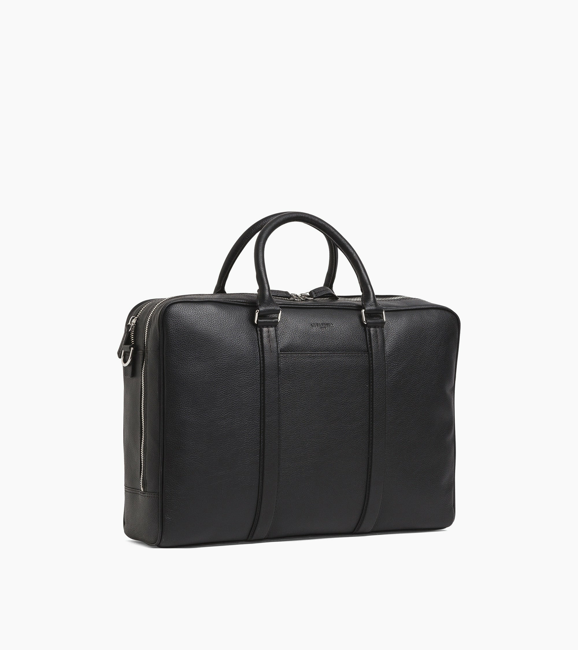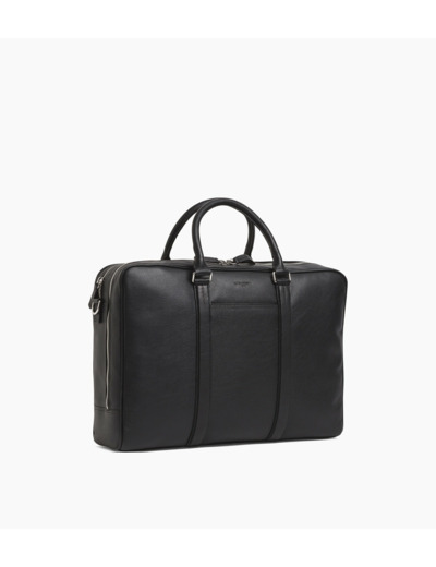 Porte-documents avec poignées rigides et détails finition argent. Bandes ajustées piquées en T, signature de la Maison. Portez-le à la main, à l’épaule ou croisé avec sa bandoulière ajustable amovible. Peut accueillir un ordinateur portable 17".Cuir de vachette pleine fleur grainé. Doublure textile.1 pression clés, 3 passants stylo, 3 poches plates, 1 poche zippée arrière. Passant trolley. Bandoulière amovible et ajustable avec passantepaule.Accessoires métalliques finition argent.Largeur : 42.5 cm x Hauteur : 30 cm x Profondeur : 12.5 cm