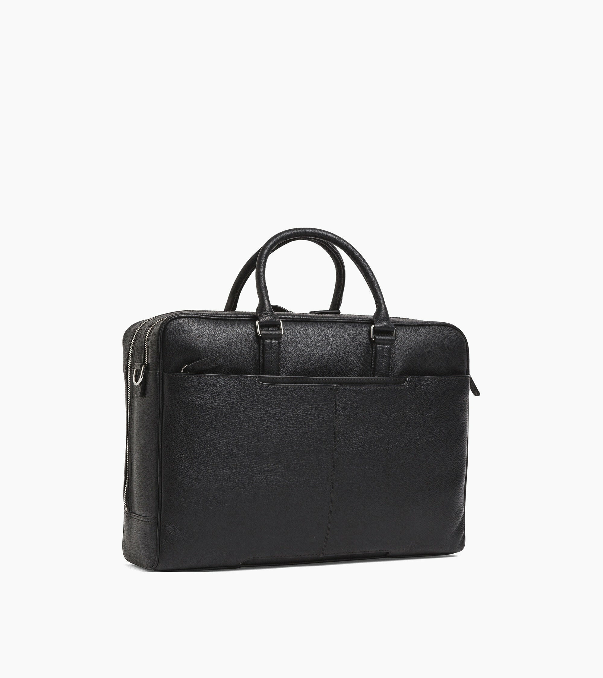 Dimensions adaptées au format 17 pouces, cuir grainé pleine fleur, deux poches zippées frontales, fermeture principale par zip, doublure intérieure soignée, poignées renforcées pour un porté confortable.