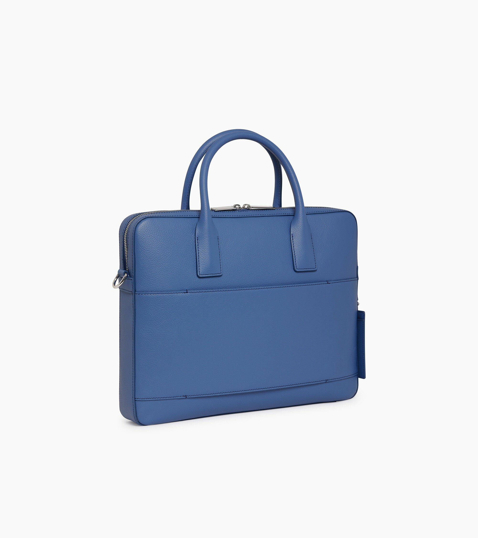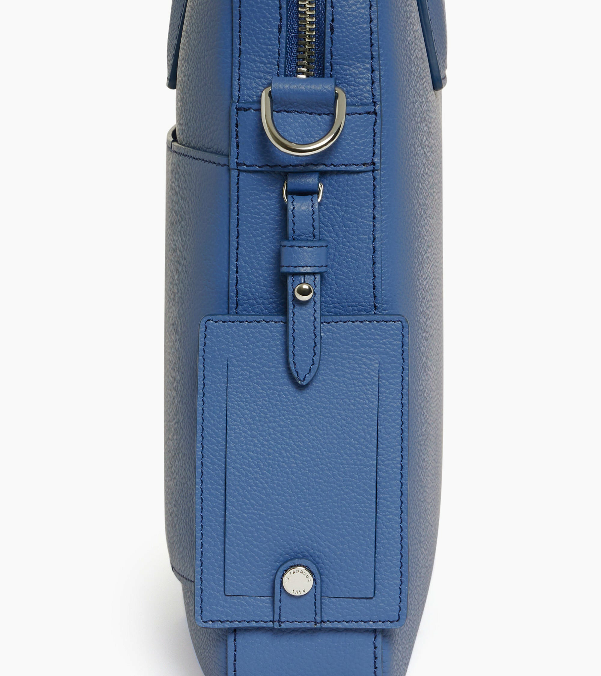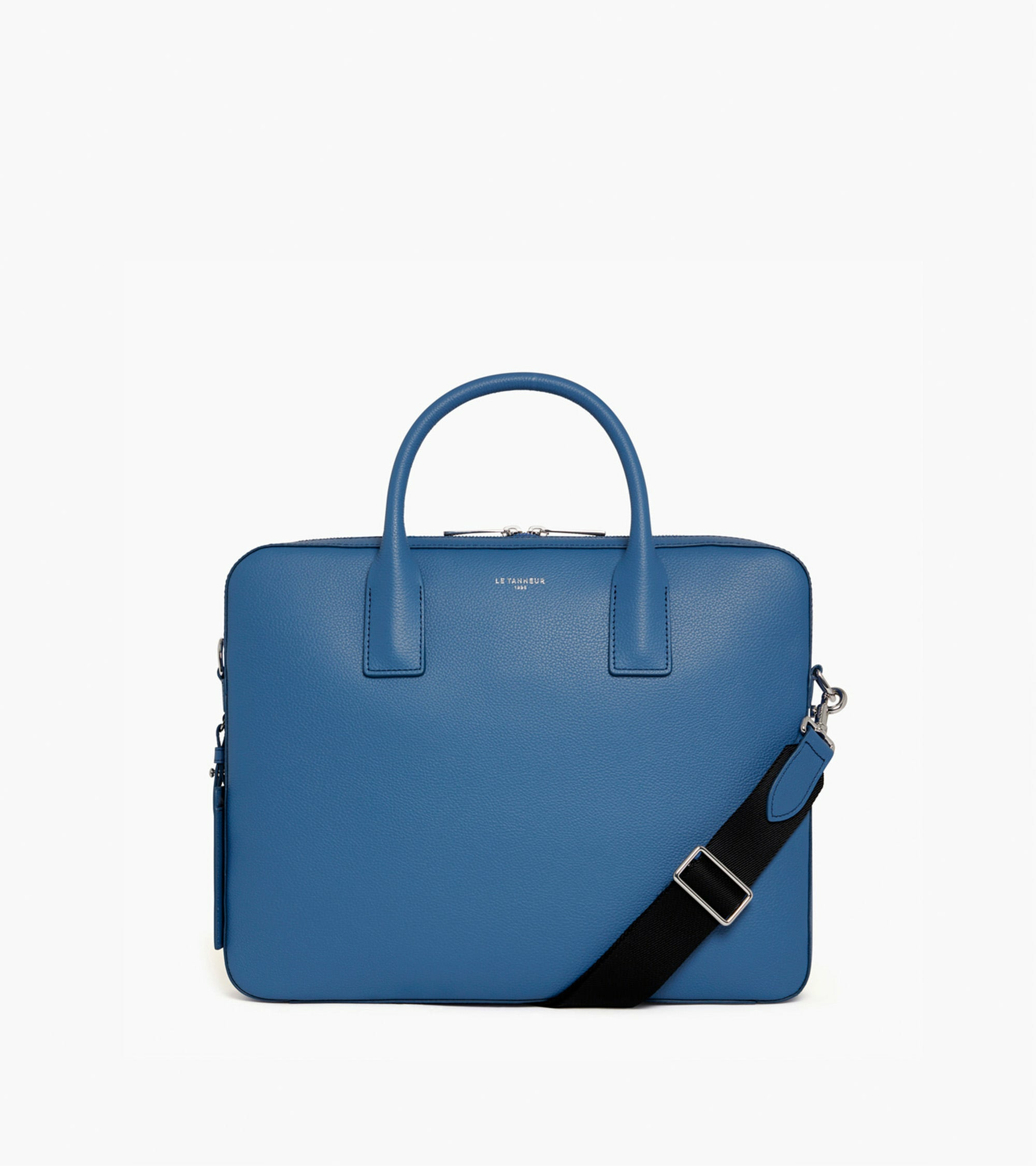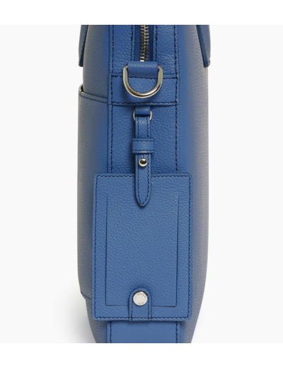 Porte-documents slim 15 finition argent avec passant trolley, charms amovible et marquage Le Tanneur argent. Porté main, épaule ou croisé grâce à sa bandoulière ajustable et amovible."Cuir de vachette pleine fleur grainé. Doublure textile Le Bleu.1 poche moussée ordinateur, 1 bouton pression. 1 poche zippée, 2 poches plates. Passant trolley. Bandoulière ajustable et amovible.Accessoires métalliques finition argent.Largeur : 36 cm x Hauteur : 29 cm x Profondeur : 5 cm