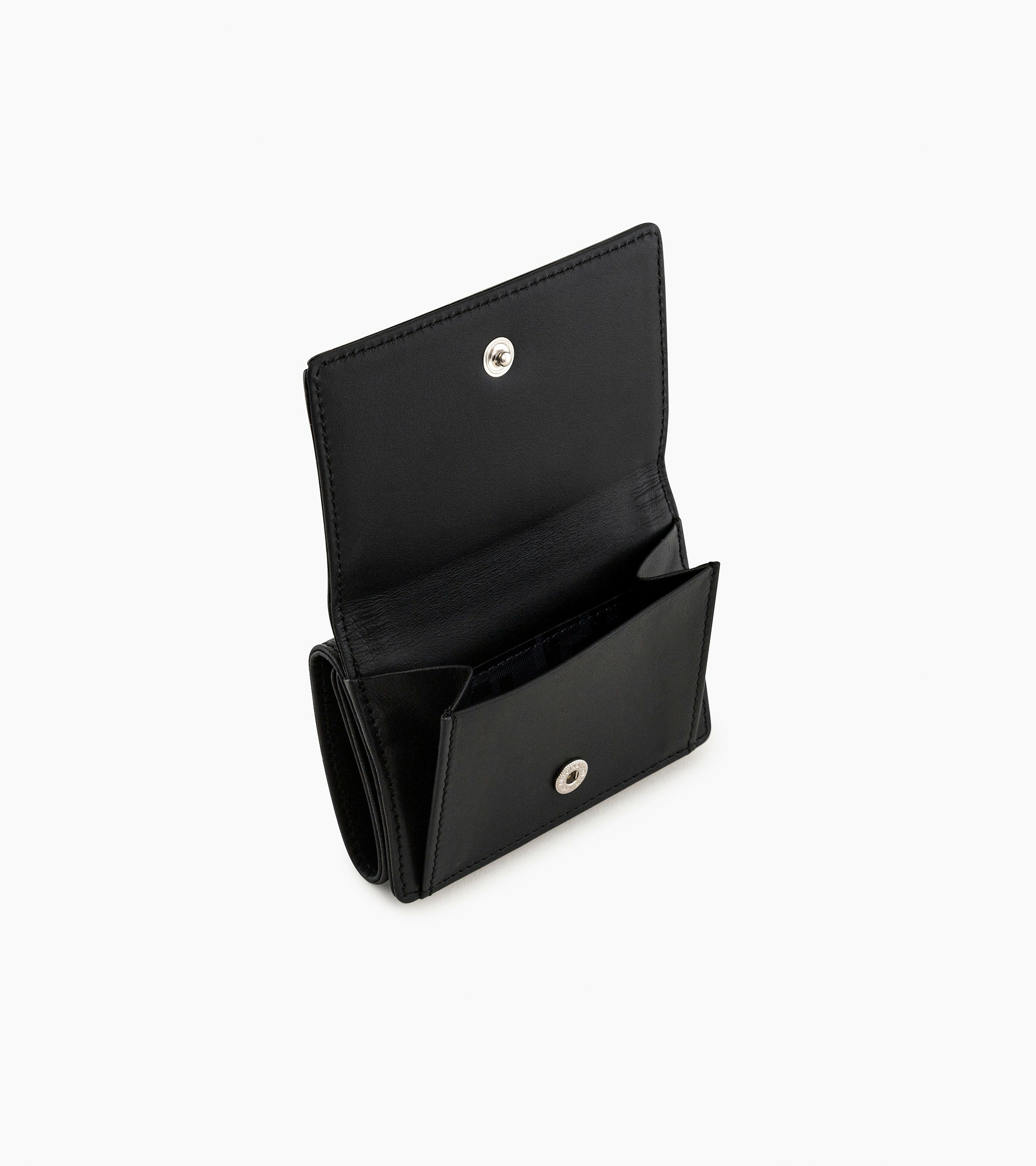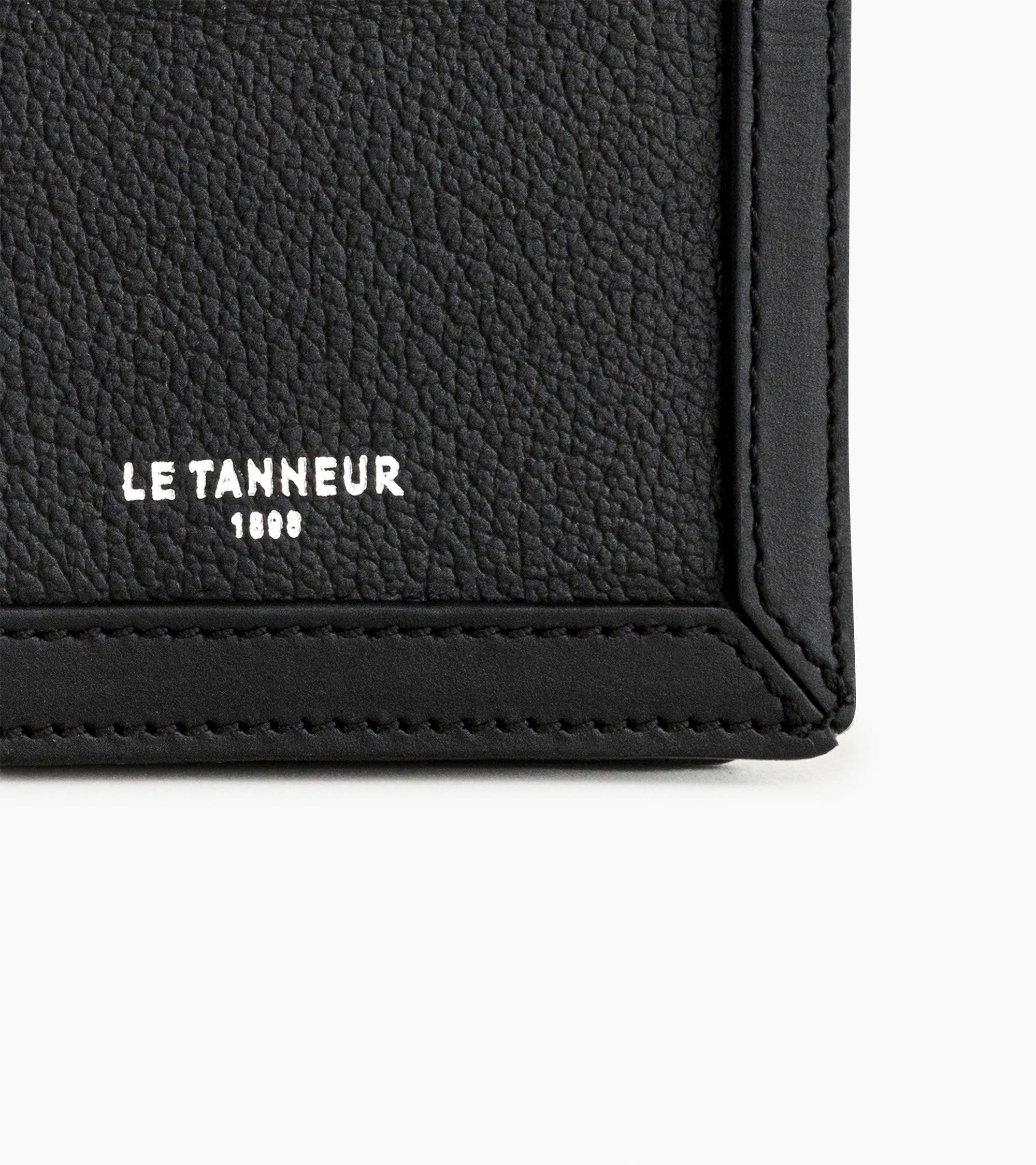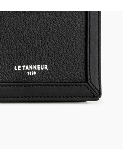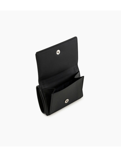 Dimensions : 10 x 8 cm. Cuir grainé pleine fleur. Fermeture par pression. Compartiments pour pièces, billets et cartes. Couleur : noir. Fabrication française.