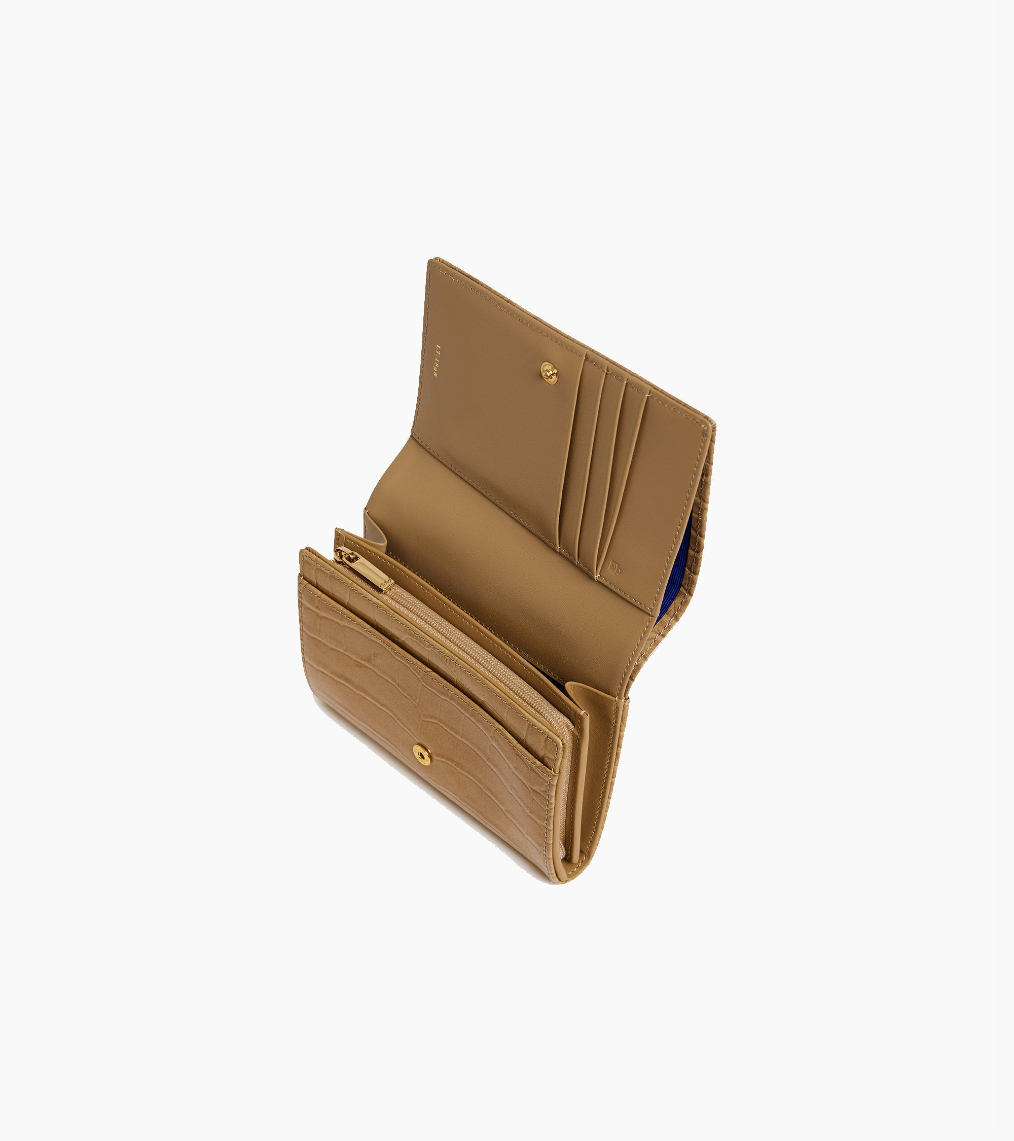 Portefeuille en cuir effet croco avec fermeture à pression et marquage Le Tanneur sur film argent. Sécurité anti-RFID.Cuir de vachette pleine fleur effet croco brillant. Doublure polyester Le Bleu.2 poches plates, 1 soufflet, 1 poche billets, 1 poche zippée monnaie et 8 compartiments cartes. 1 poche plate arrière.Accessoires métalliques finition doré clair.Largeur : 14.5 cm x Hauteur : 10 cm x Profondeur : 1 cm
