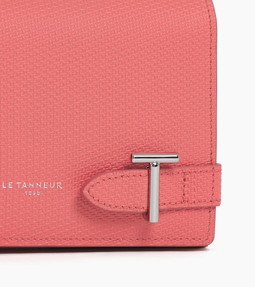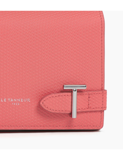 Portefeuille avec double T signature, fermeture pression et poche monnaie zippée. Dispose d'une protection RFID.Cuir de vachette grain t pleine fleur. Doublure textile Le Bleu.4 poches plates, 10 compartiments cartes, 1 poche zippée 2 soufflets. 1 poche plate arrière.Accessoires métalliques finition argent.Largeur : 14 cm x Hauteur : 10 cm x Profondeur : 1 cm
