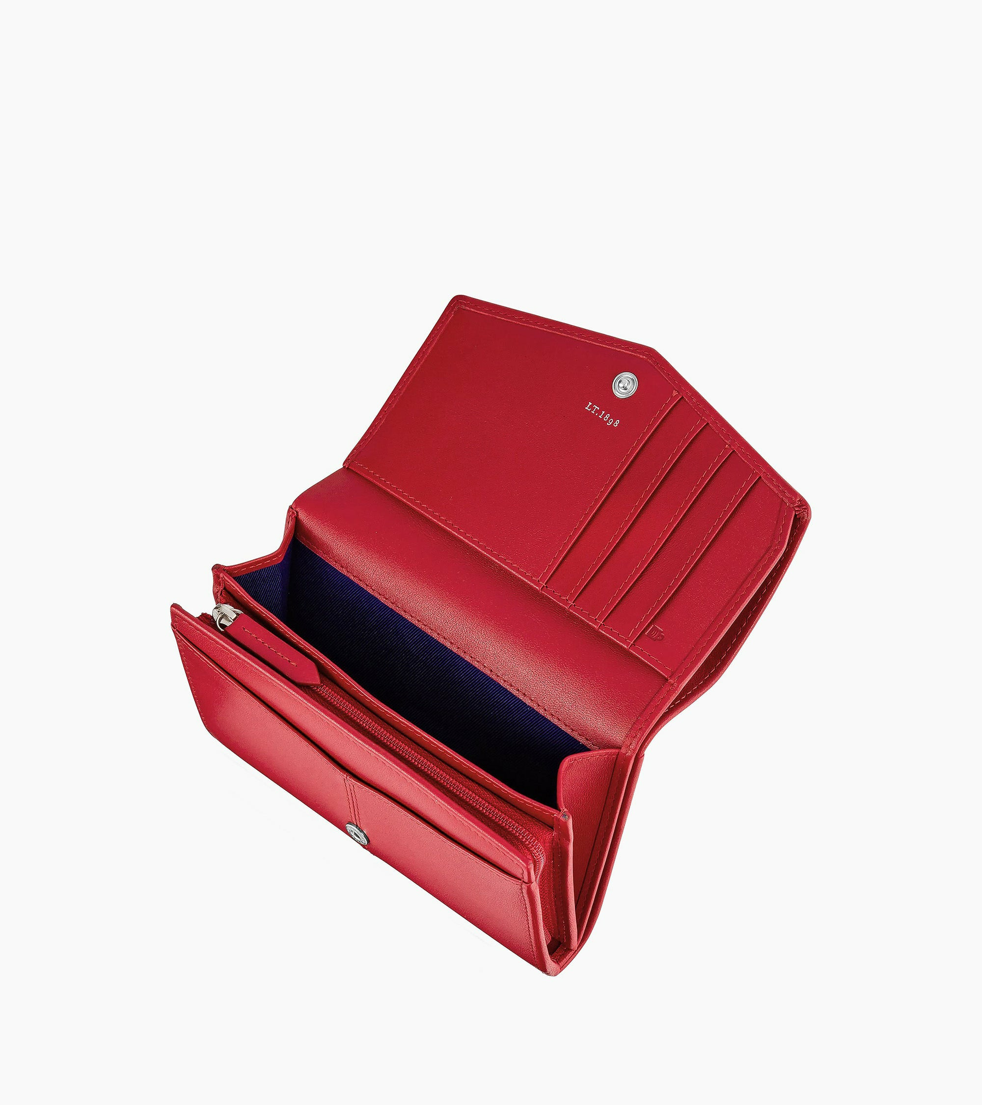 En plus de ses lignes saillantes, son cuir de couleur vive et son intérieur à la fois graphique et moderne. Ce porte-monnaie zippé intègre un porte-cartes amovible.Cuir de vachette pleine fleur lisse. Doublure textile.2 poches plates, 1 soufflet, 1 poche chéquier, 1 poche zippée monnaie, 1 passant stylo et 12 compartiments cartes, 1 poche plate arrière.Accessoires métalliques finition argent.Largeur : 15 cm x Hauteur : 10 cm