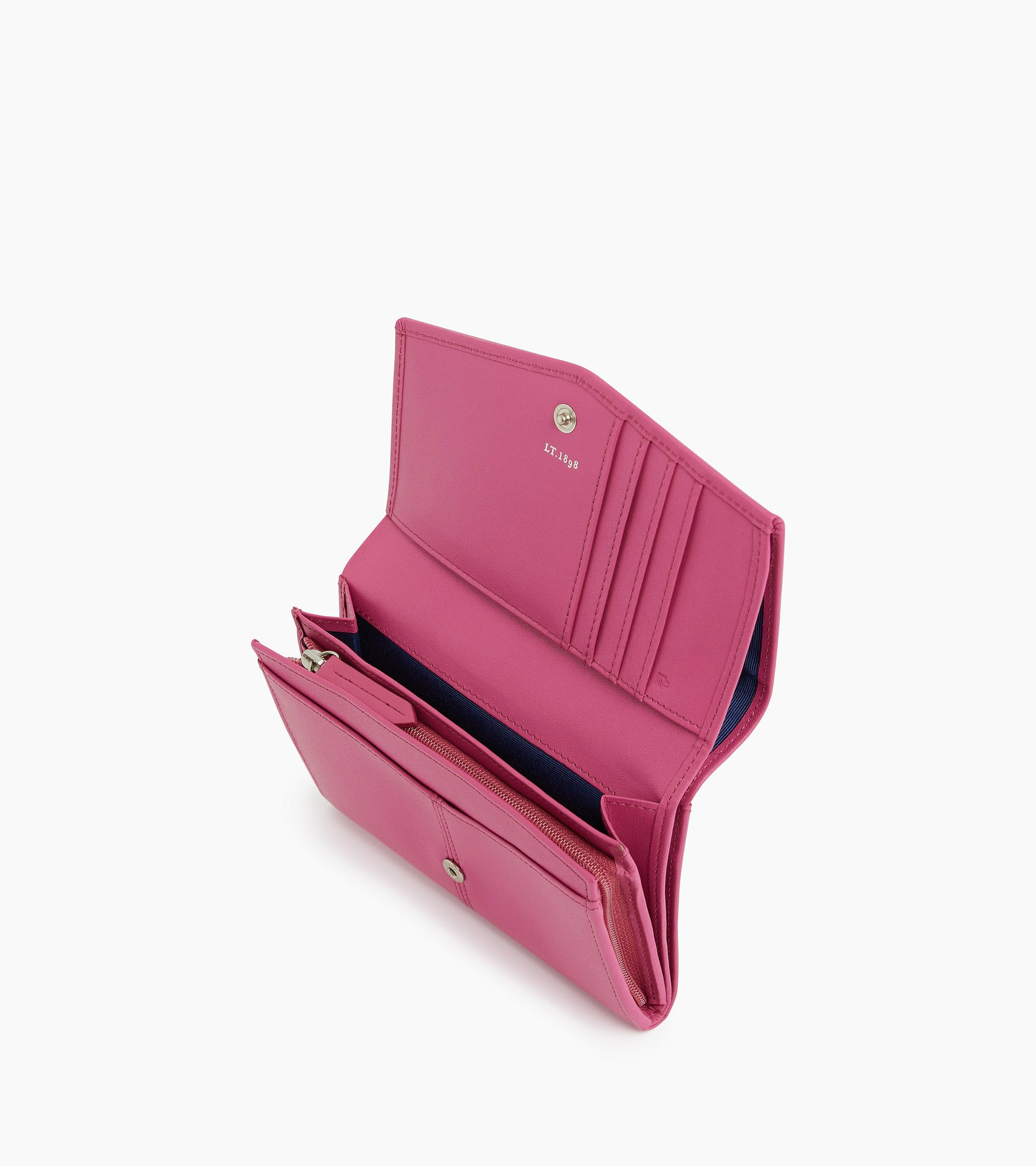 Portefeuille avec fermeture pression et marquage Le Tanneur finition argent.Cuir de vachette pleine fleur lisse. Doublure textile.1 poche billets et 4 compartiments cartes. 1 poche plate avant.Accessoires métalliques finition argent.Largeur : 15 cm x Hauteur : 10 cm