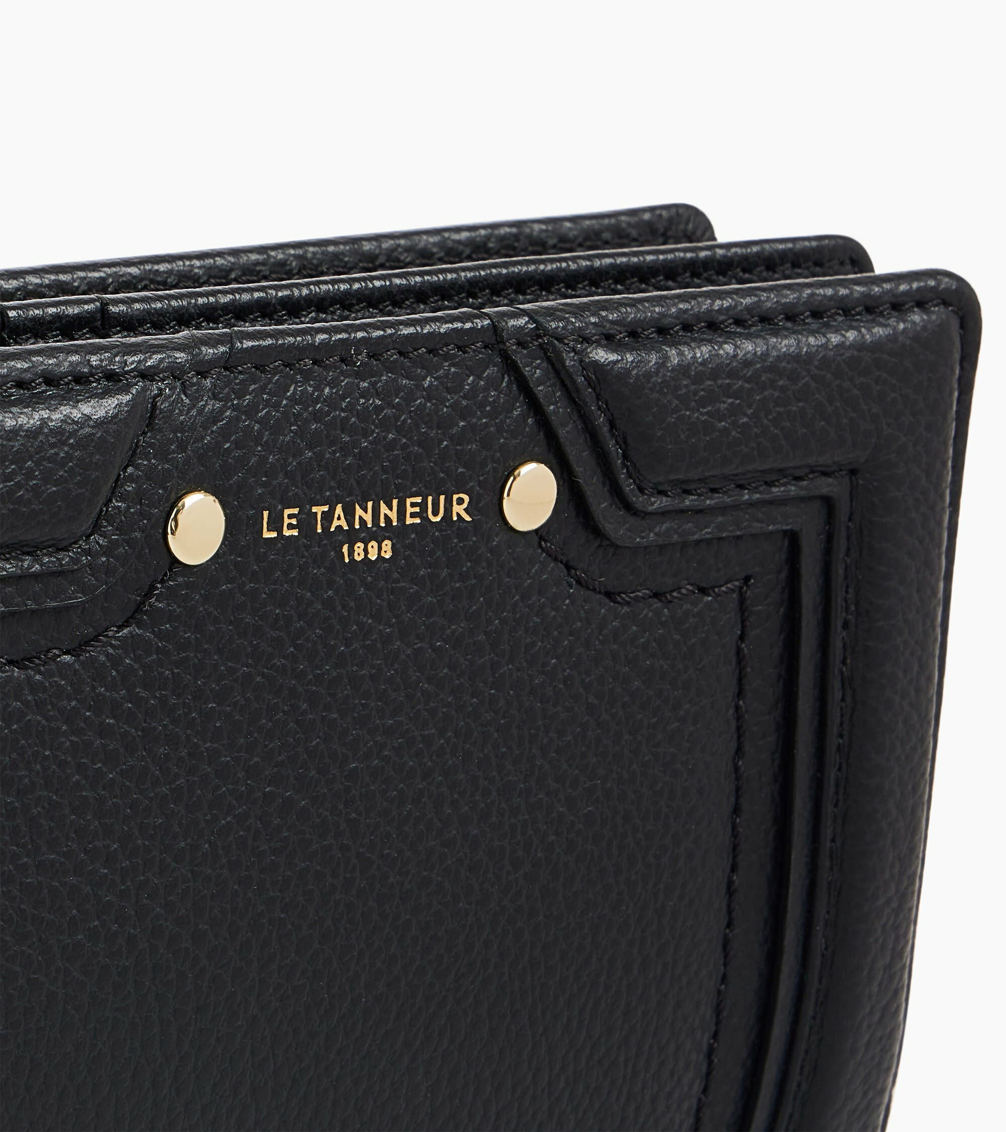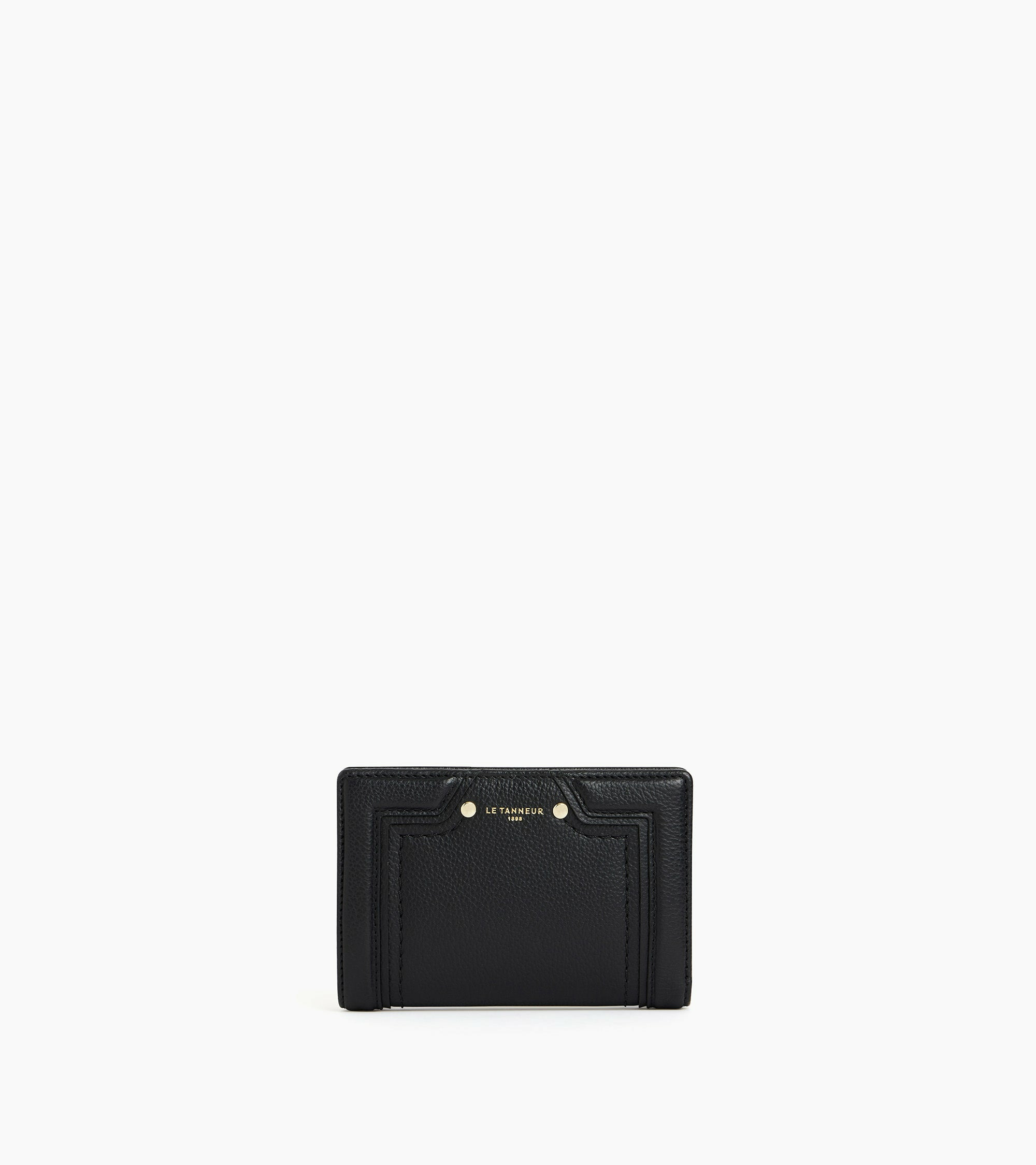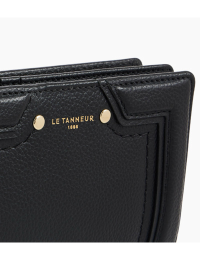 Portefeuille moyen format avec fermeture pression, poche monnaie zippée et marquage Le Tanneur. Dispose d'une protection RFID.Cuir de vachette pleine fleur grainé. Doublure textile jacquard noir.3 poches plates, 1 poche zippée monnaie 2 soufflets 1 poche billets et 10 compartiments cartes.Accessoires métalliques finition doré clair.Largeur : 13 cm x Hauteur : 9 cm