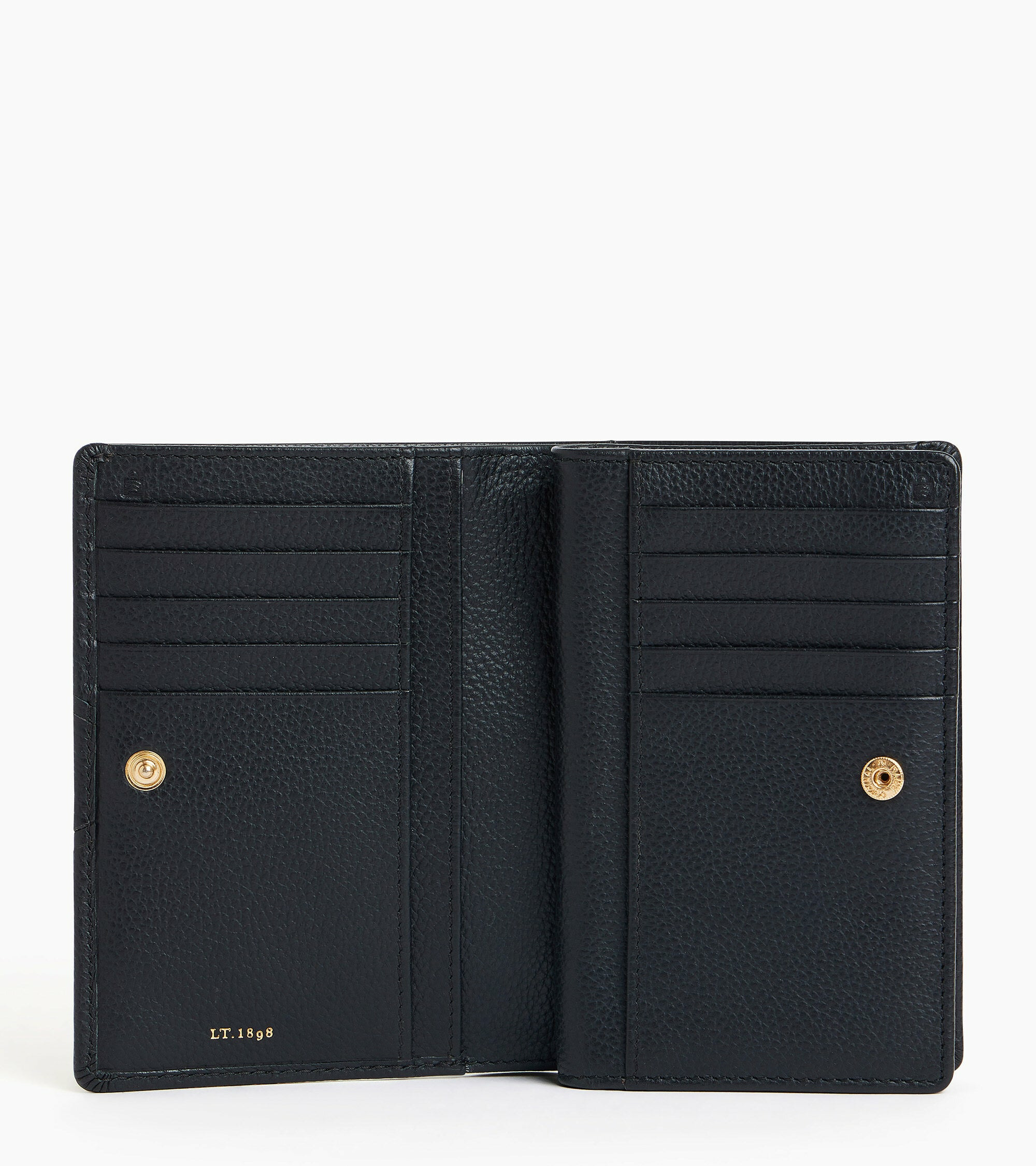 Dimensions : moyen modèle. Matière : cuir grainé. Fermeture par bouton-pression. Compartiments multiples pour cartes, billets et monnaie. Couleur et finitions selon disponibilité.