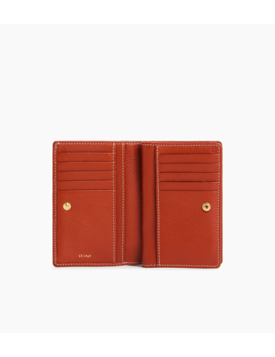 Dimensions : moyen modèle. Matière : cuir grainé. Fermeture par bouton-pression. Compartiments multiples pour cartes, billets et monnaie. Couleur et finitions selon disponibilité.