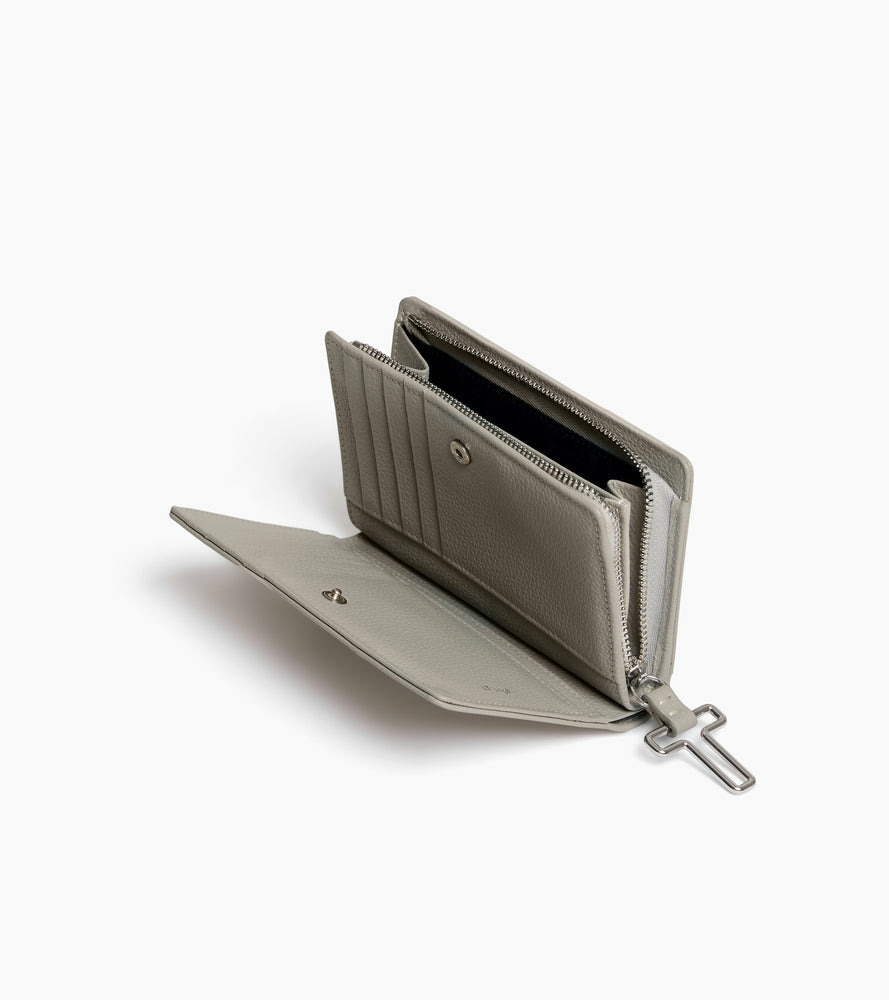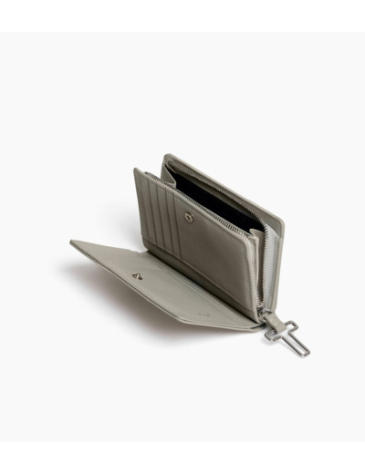 Portefeuille moyen format avec fermeture pression, marquage Le Tanneur et poche monnaie zip T signature.Cuir de vachette pleine fleur grainé. Doublure textile jacquard T crépuscule.1 poche monnaie zippée, 2 soufflet. 1 poche billets, 10 compartiments cartes et 3 poches plates.Accessoires métalliques finition argent.Largeur : 9.5 cm x Hauteur : 14 cm x Profondeur : 1 cm