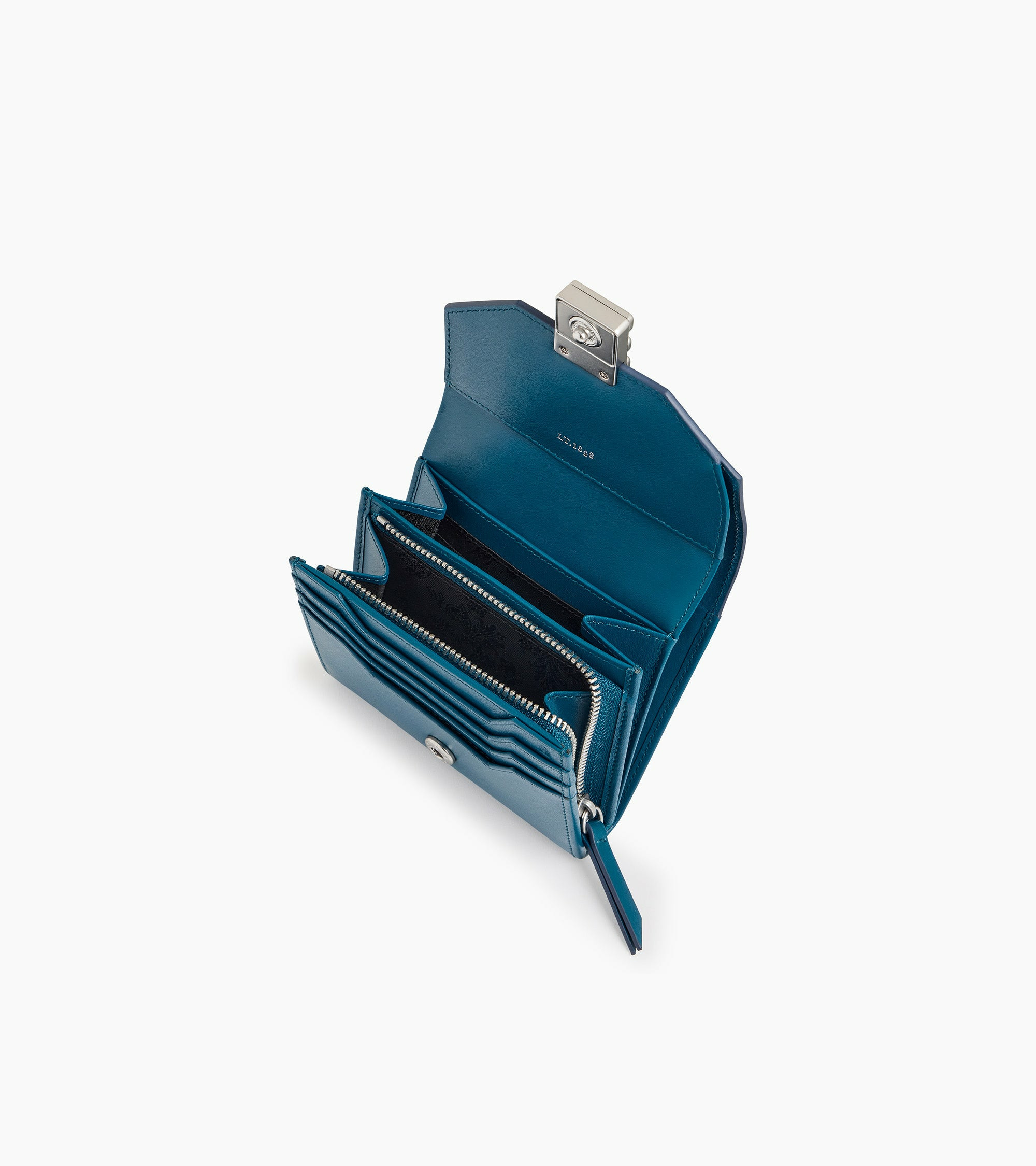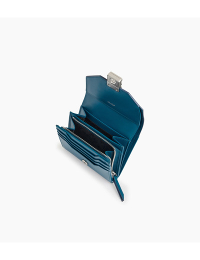 Petit portefeuille avec fermoir signature et poche monnaie zippée. Dispose d'une protection RFID.Cuir de vachette pleine fleur lisse. Doublure textile jacquard anniversaire noir4 compartiments cartes, 1 poche zippée monnaie, 1 soufflet et 3 compartiments cartes. 2 poches plates. 1 poche plate arrière.Accessoires métalliques finition argent mat.Largeur : 11 cm x Hauteur : 9.5 cm x Profondeur : 2.5 cm