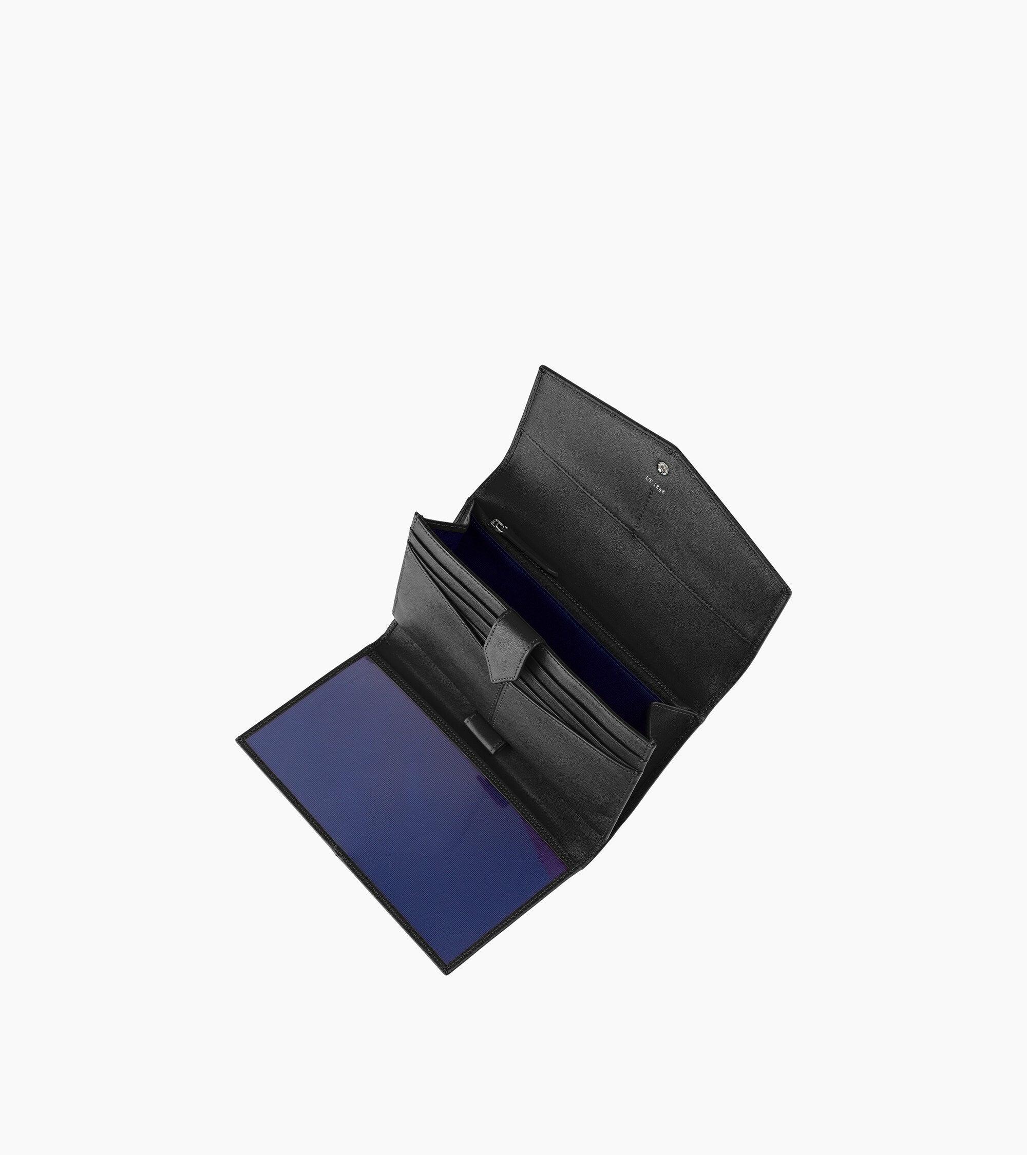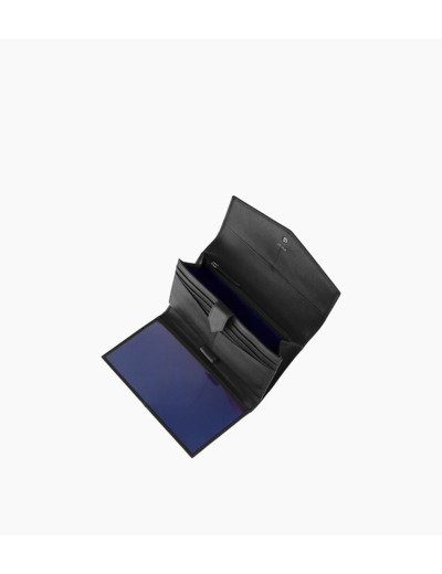 En plus de ses lignes saillantes, son cuir lisse et son intérieur à la fois graphique et moderne. Ce compagnon comporte une doublure Le Bleu signature de la Maison.Cuir de vachette pleine fleur lisse. Doublure textile.2 poches plates, 1 soufflet, 1 poche chéquier, 1 poche zippée monnaie, 1 passant stylo et 12 compartiments cartes, 1 poche plate arrière.Accessoires métalliques finition argent.Largeur : 19 cm x Hauteur : 12 cm