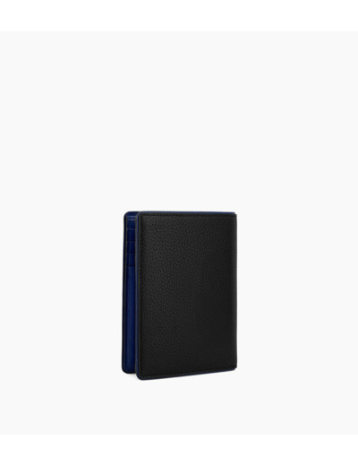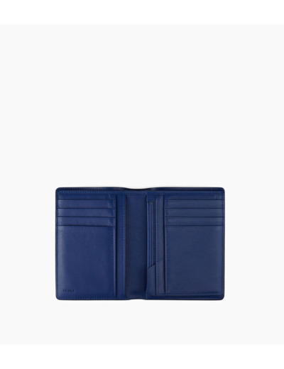 Portefeuille billets modèle vertical, avec poche monnaie zippée et liseré bord franc bleu signature. Sécurité anti-RFID.Cuir de vachette grainé. Doublure textile.4 poches plates, 1 poche monnaie zippée, 2 poches billets et 9 compartiments cartes.Accessoires métalliques finition argent.Largeur : 12 cm x Hauteur : 10 cm