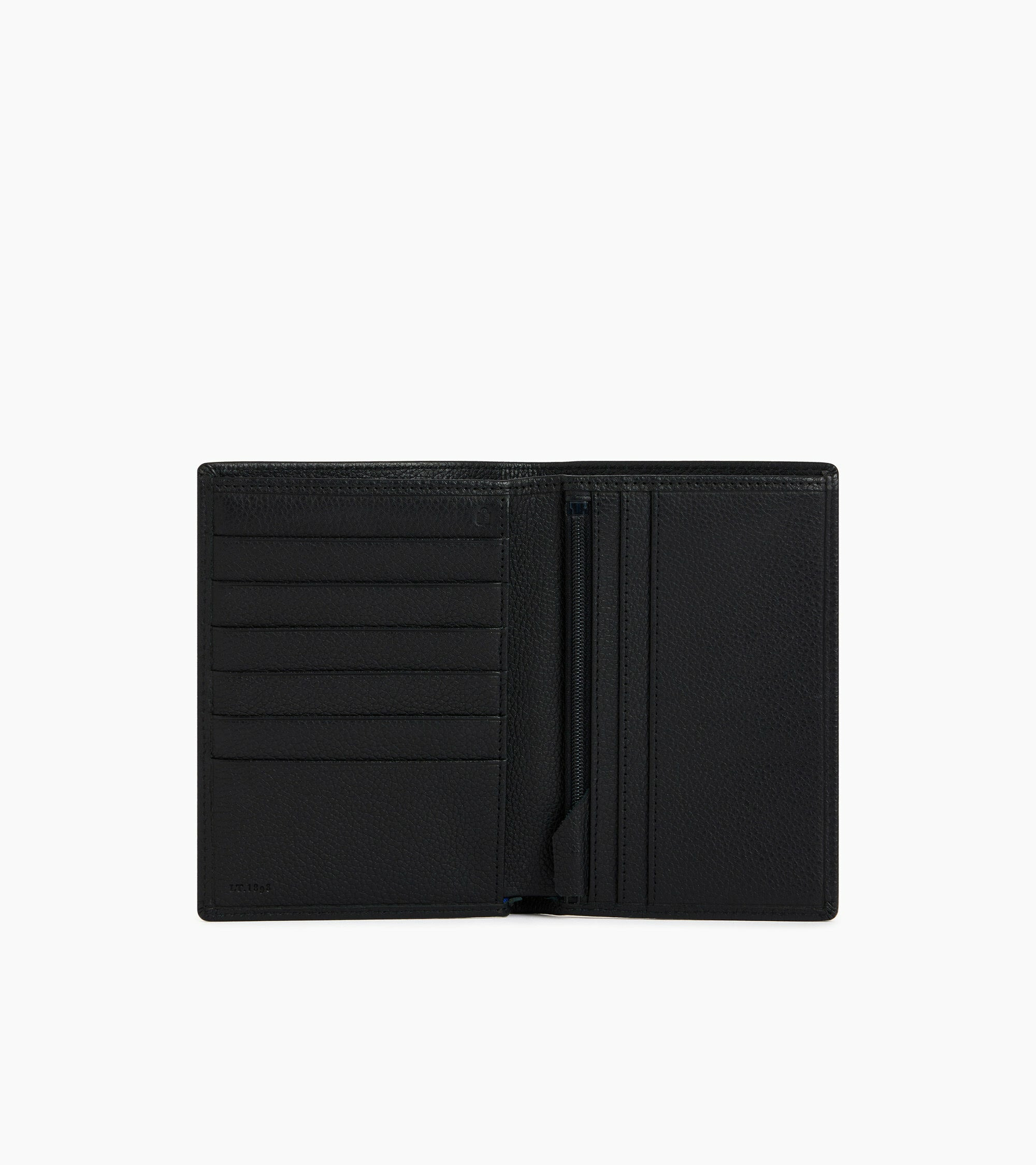 Dimensions : environ 11 x 9 cm. Matière : cuir grainé pleine fleur. Fermeture : zip métallique robuste. Compartiments : plusieurs emplacements pour cartes, un compartiment billets, une poche zippée pour pièces.