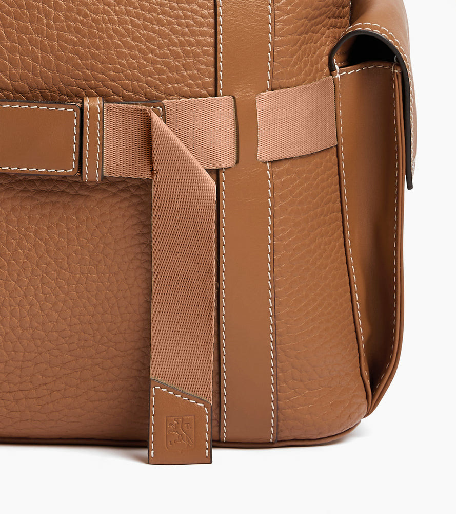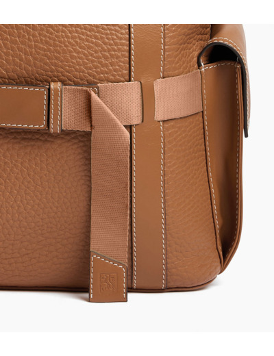 Dimensions : hauteur 42 cm, largeur 30 cm, profondeur 15 cm. Matières : cuir grain buffle et cuir lisse. Fermeture par rabat avec boucle magnétique. Bretelles ajustables pour un porté confortable. Compartiment principal spacieux avec poche intérieure zippée.