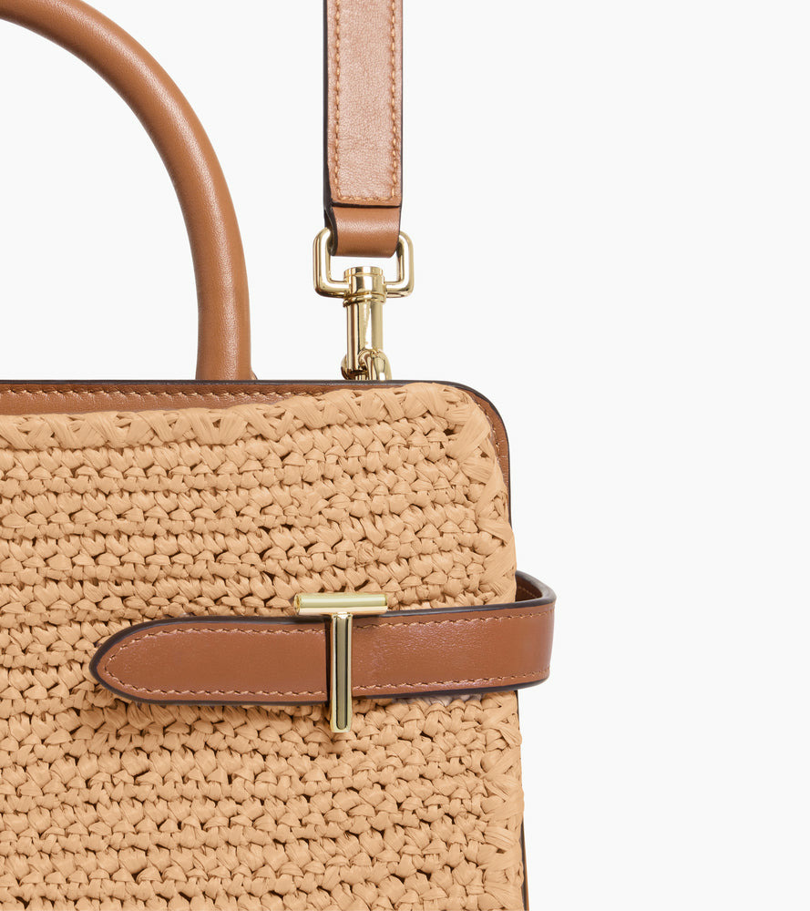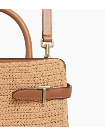 Sac à main moyen modèle effet raphia et cuir lisse avec fermoirs T signature, doublure jacquard anniversaire. Marquage Le Tanneur et éléments métalliques finition doré clair. Porté main, épaule ou croisé grâce à sa bandoulière ajustable et amovible.Cuir de vachette pleine fleur lisse et matière effet raphia. Doublure textile jacquard anniversaire noir.4 compartiments dont 1 zippé. 2 poches plates. 1 poche plate arrière. Bandoulière ajustable et amovibleAccessoires métalliques finition doré clair.Largeur : 28 cm x Hauteur : 19.5 cm x Profondeur : 12.5 cm