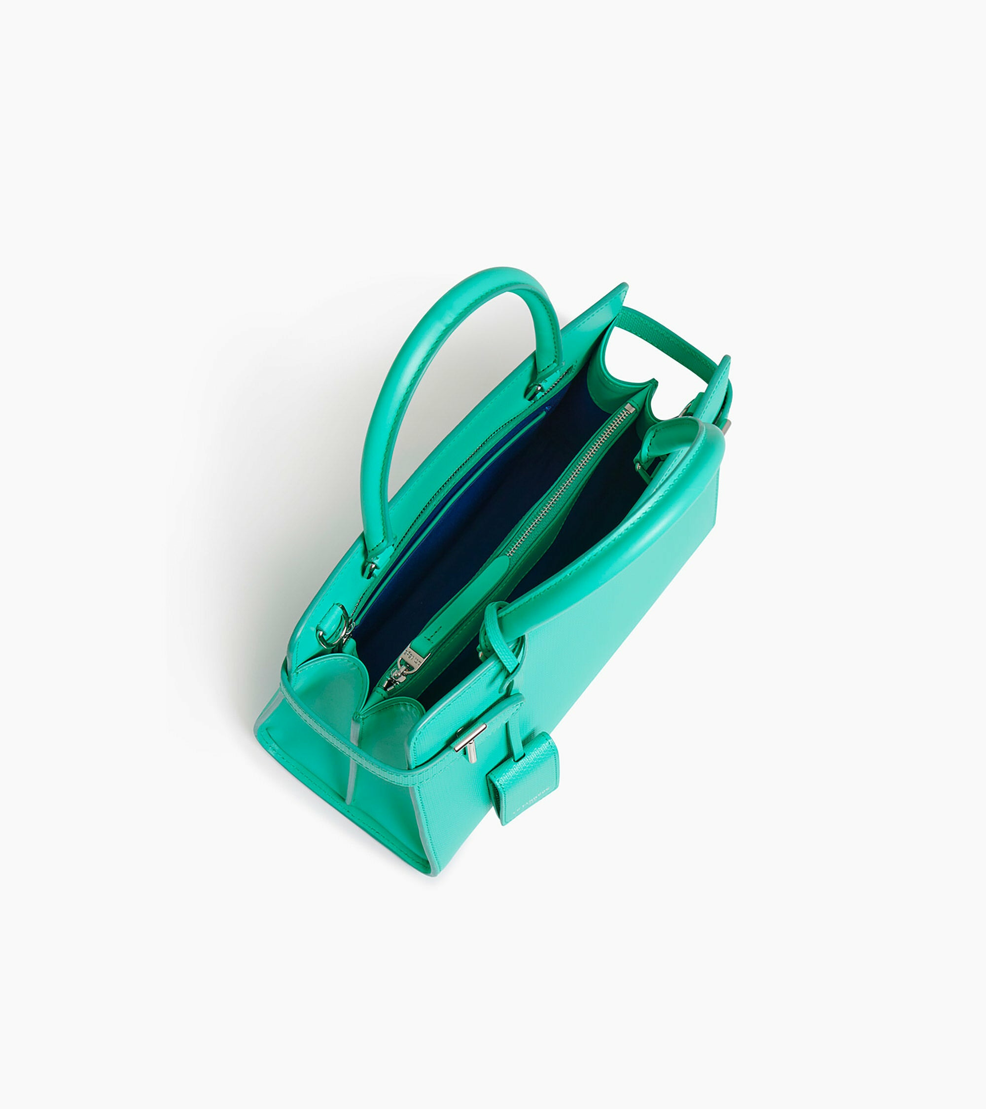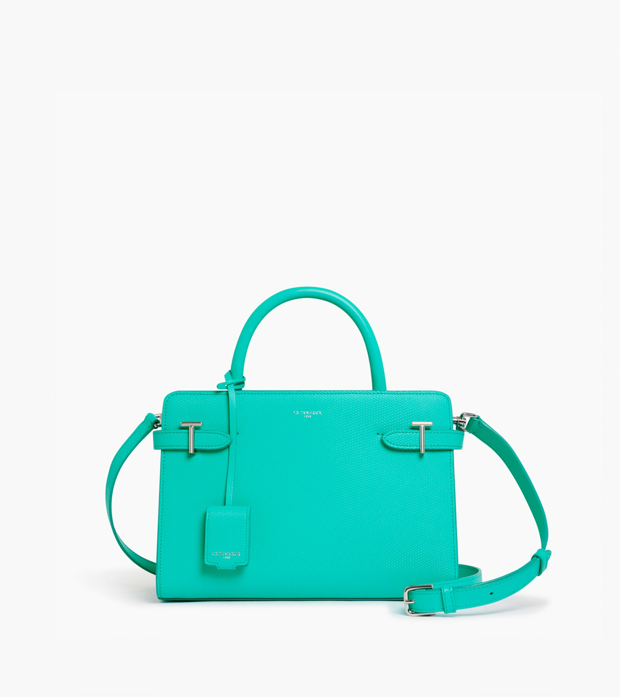 Sac à main moyen modèle rigide arbore les fermoirs T de la Maison. Il dispose de patins de protection et d'un charms amovible. Portez-le à la main, à l'épaule ou croisé grâce à sa bandoulière amovible ajustable.Cuir de vachette signature T. Doublure textile Le Bleu.2 poches plates et 2 poches zippées. 1 poche plate arrière. Bandoulière amovible et ajustable.Accessoires métalliques finition argent.Largeur : 28 cm x Hauteur : 20 cm x Profondeur : 14 cm