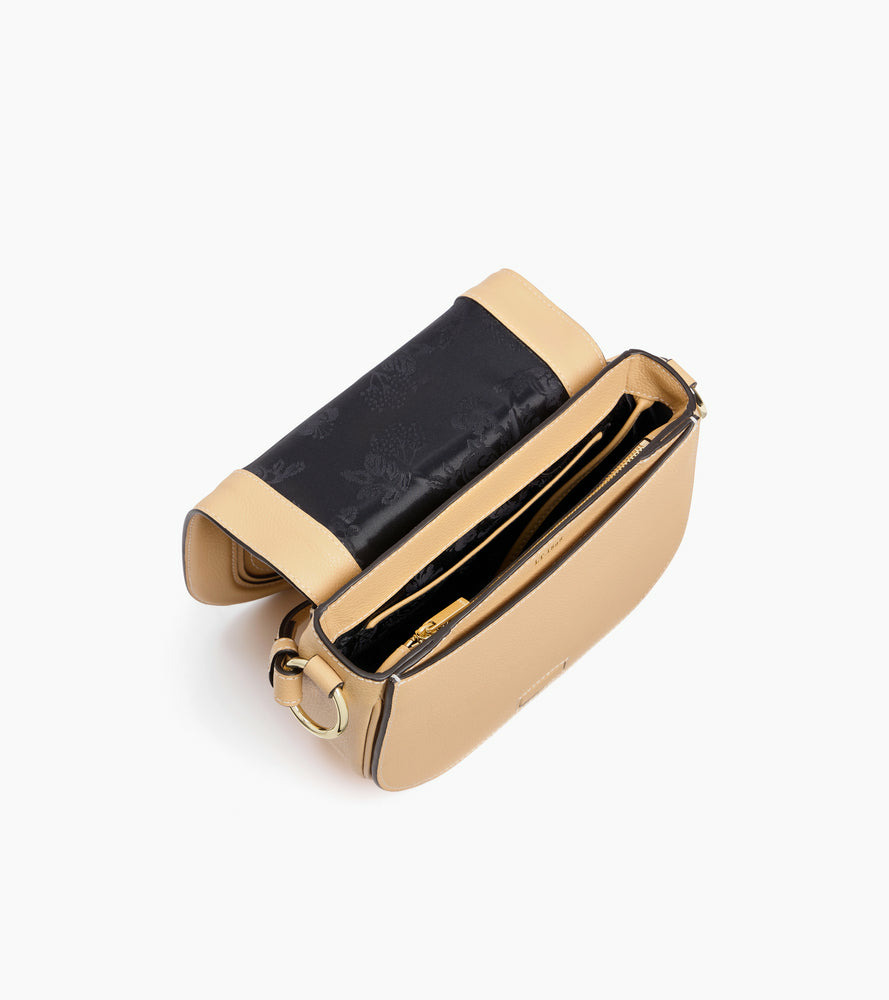 Besace moyen modèle avec marquage Le Tanneur et intérieur jacquard anniversaire 125 ans. Porté main, croisé ou épaule grâce à sa bandoulière ajustable et sa poignée amovible ajustée au corps du sac.Cuir de vachette grainé pleine fleur. Doublure textile jacquard anniversaire noir.1 poche plate, 1 poche zippée et 1 poche plate. Mousqueton clés. 1 poche plate arrière. Poignée amovible. Bandoulière ajustable et amovible.Accessoires métalliques finition doré clair.Largeur : 22 cm x Hauteur : 18 cm x Profondeur : 8 cm