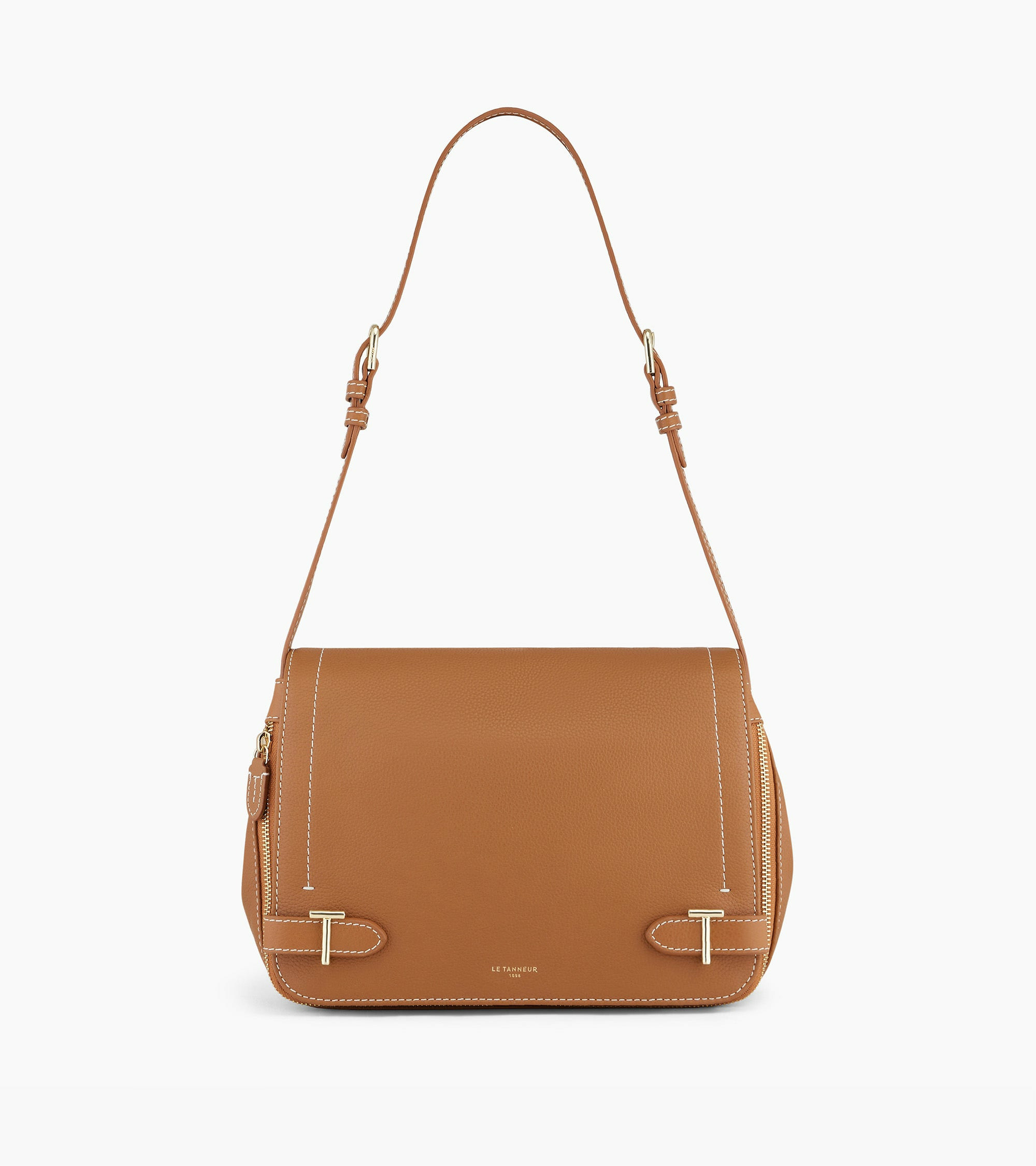 Sac bandoulière moyen modèle deux soufflets avec double T signature. Porté épaule ou croisé grâce à sa bandoulière ajustable.Cuir de vachette pleine fleur grainé. Doublure textile Le Bleu.2 poches plates et 1 poche zippée, 2 soufflets zippés, 1 poche arrière, bouton aimanté. Bandoulière ajustable et mini Bandoulière porteepaule.Accessoires métalliques finition doré clair.Largeur : 28 cm x Hauteur : 20 cm x Profondeur : 9 cm