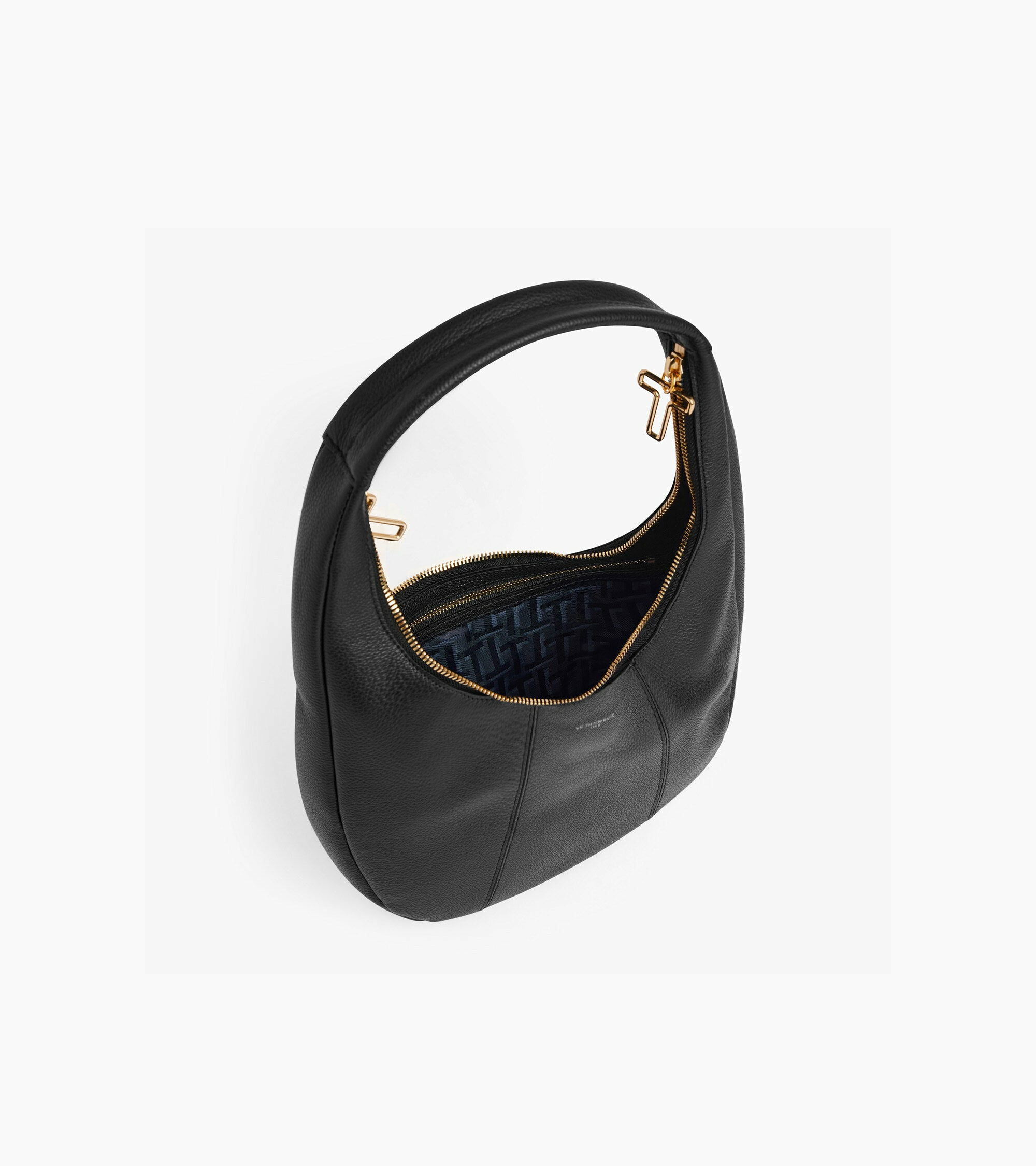 Sac hobo moyen format avec zip signature double fermeture et marquage Le Tanneur. Porté main.Cuir de vachette pleine fleur grainé. Doublure textile.1 poche plate avant et 1 poche zippée.Accessoires métalliques finition doré clair.Largeur : 28 cm x Hauteur : 17 cm x Profondeur : 7 cm