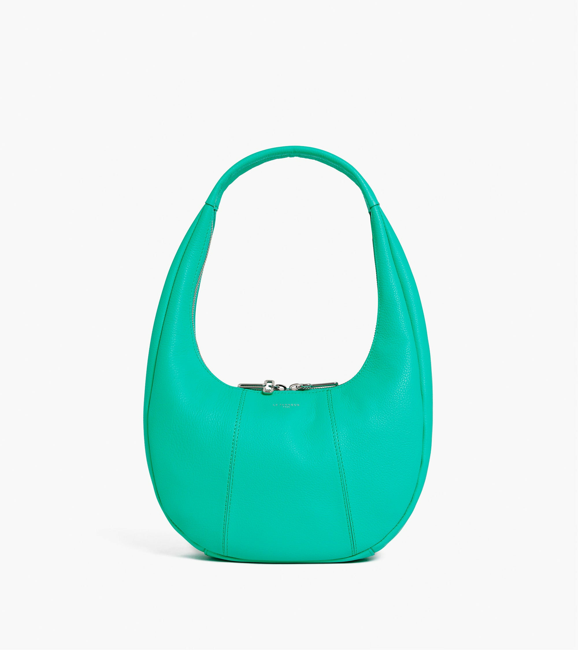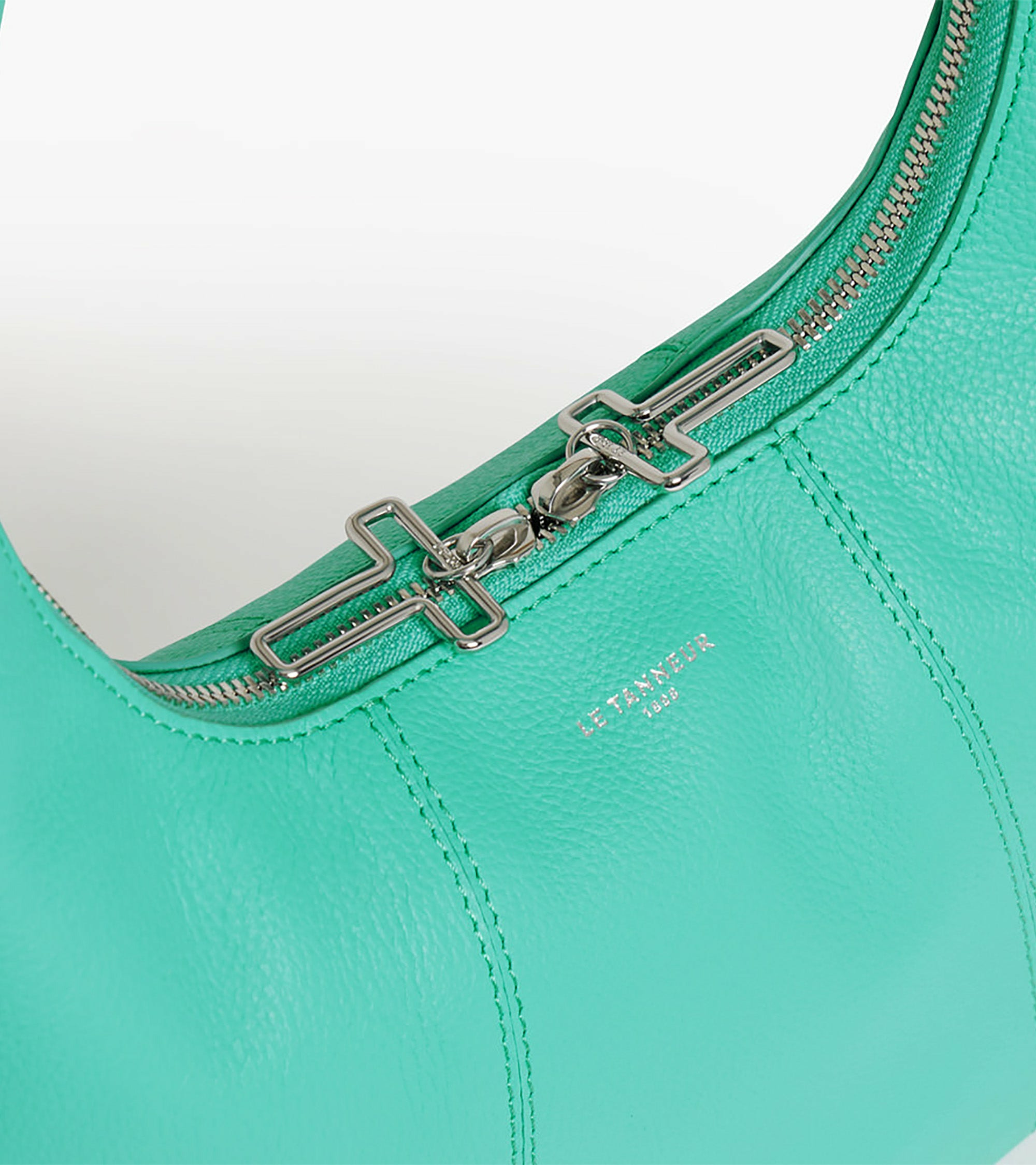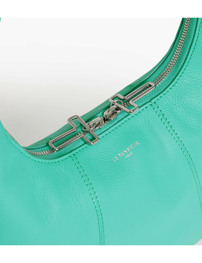 Petit sac hobo avec zip signature et marquage Le Tanneur. Porté main.Cuir de vachette pleine fleur grainé. Doublure textile jacquard.1 poche plate avant et 1 poche zippée.Accessoires métalliques finition argent.Largeur : 28 cm x Hauteur : 17 cm x Profondeur : 7 cm