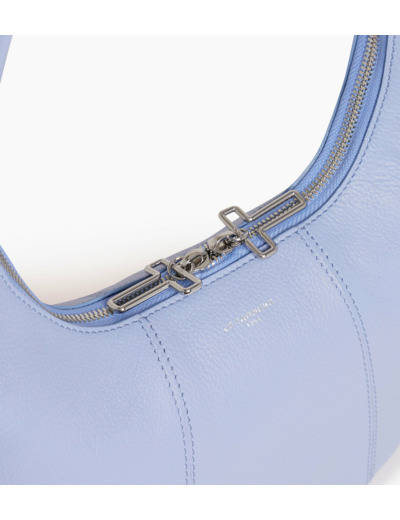 Petit sac hobo avec zip signature et marquage Le Tanneur. Porté main.Cuir de vachette pleine fleur grainé. Doublure textile jacquard.1 poche plate avant et 1 poche zippée.Accessoires métalliques finition argent.Largeur : 28 cm x Hauteur : 17 cm x Profondeur : 7 cm