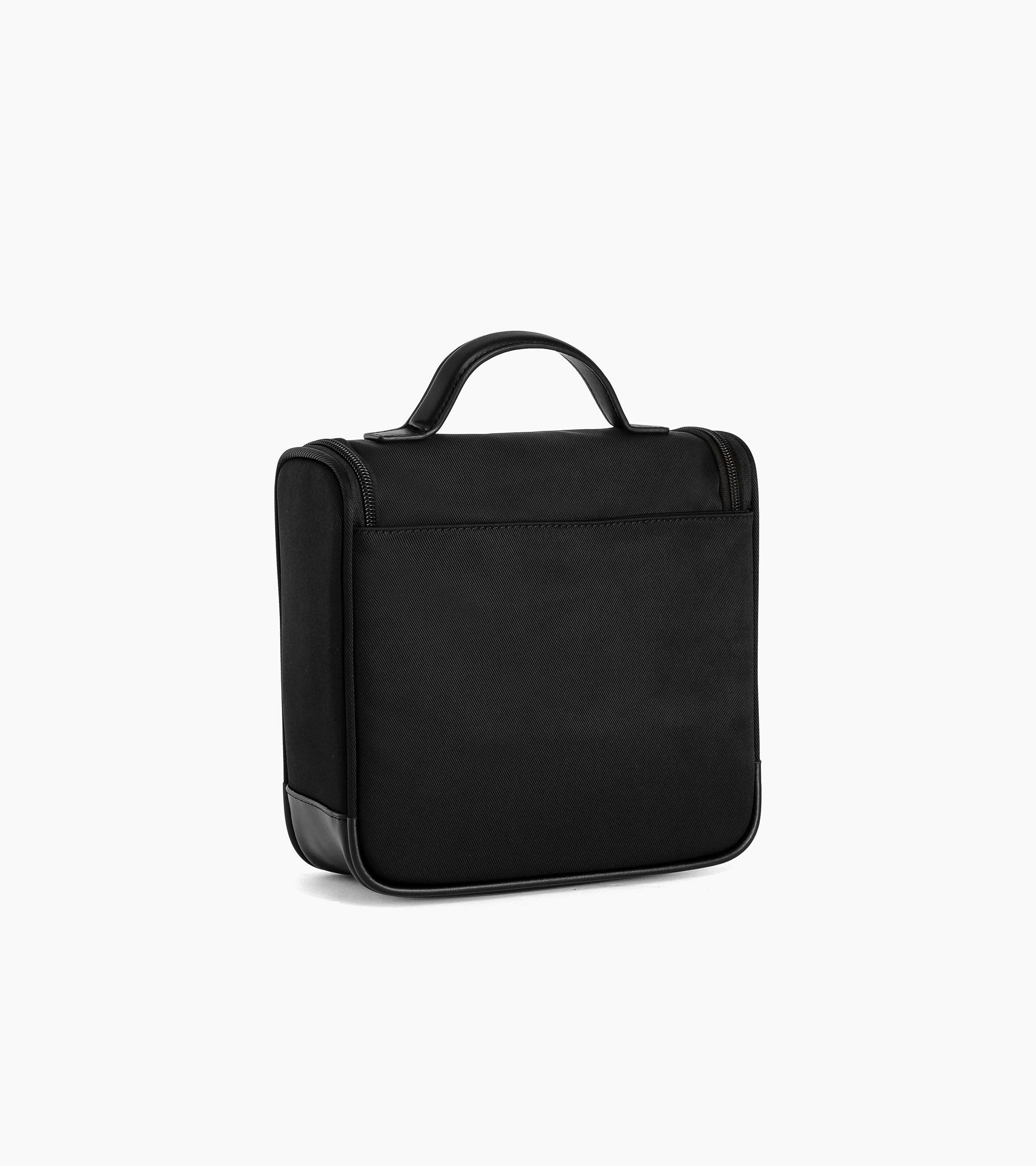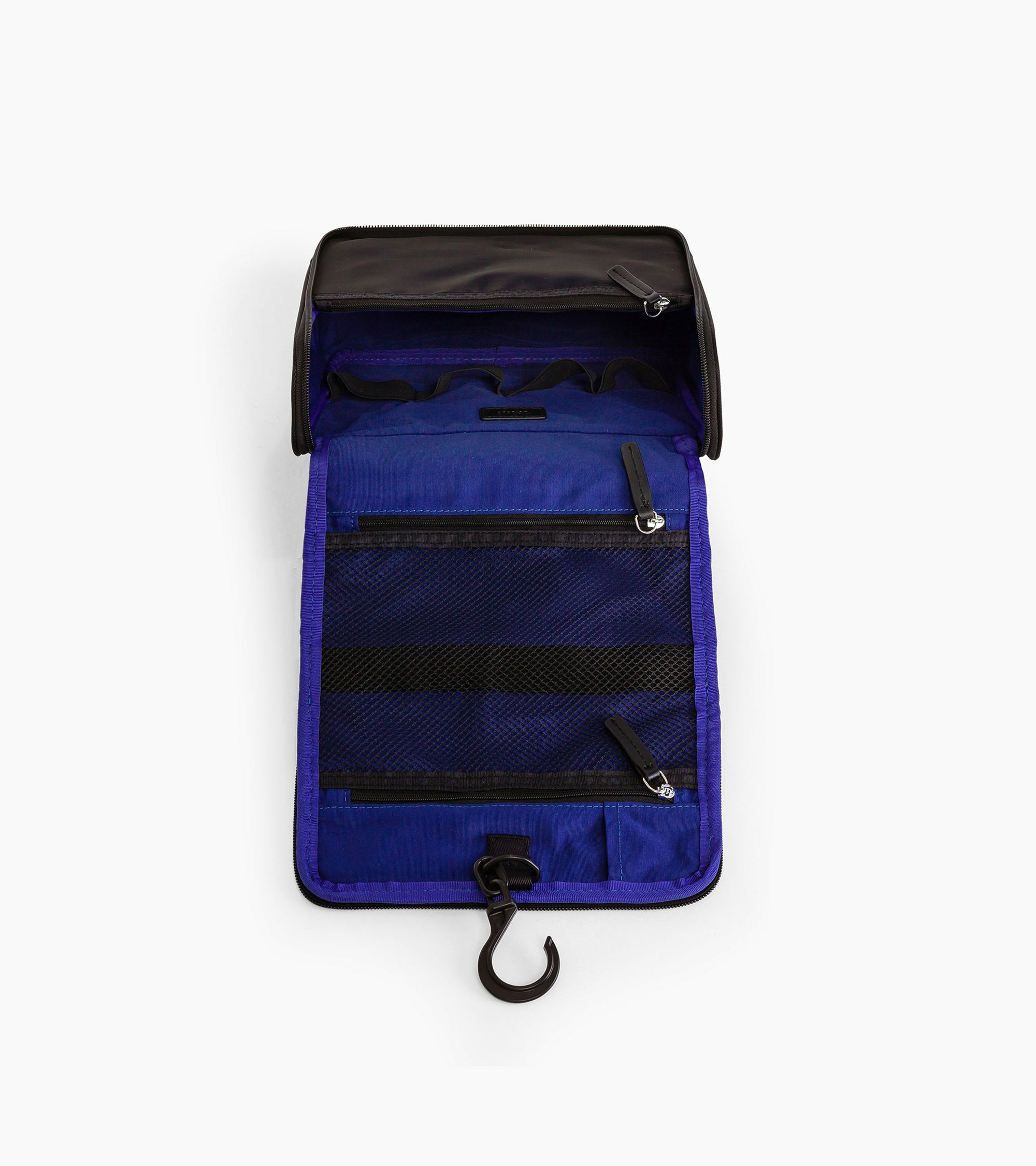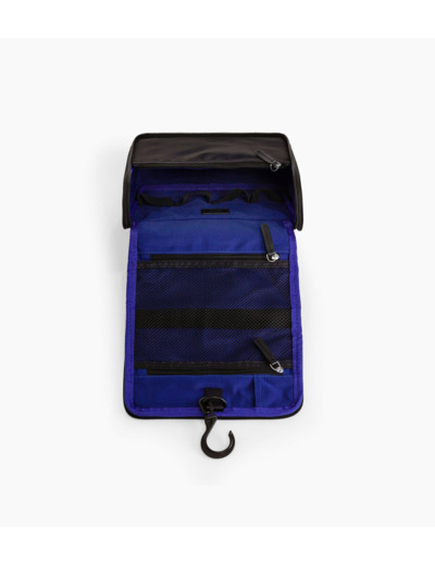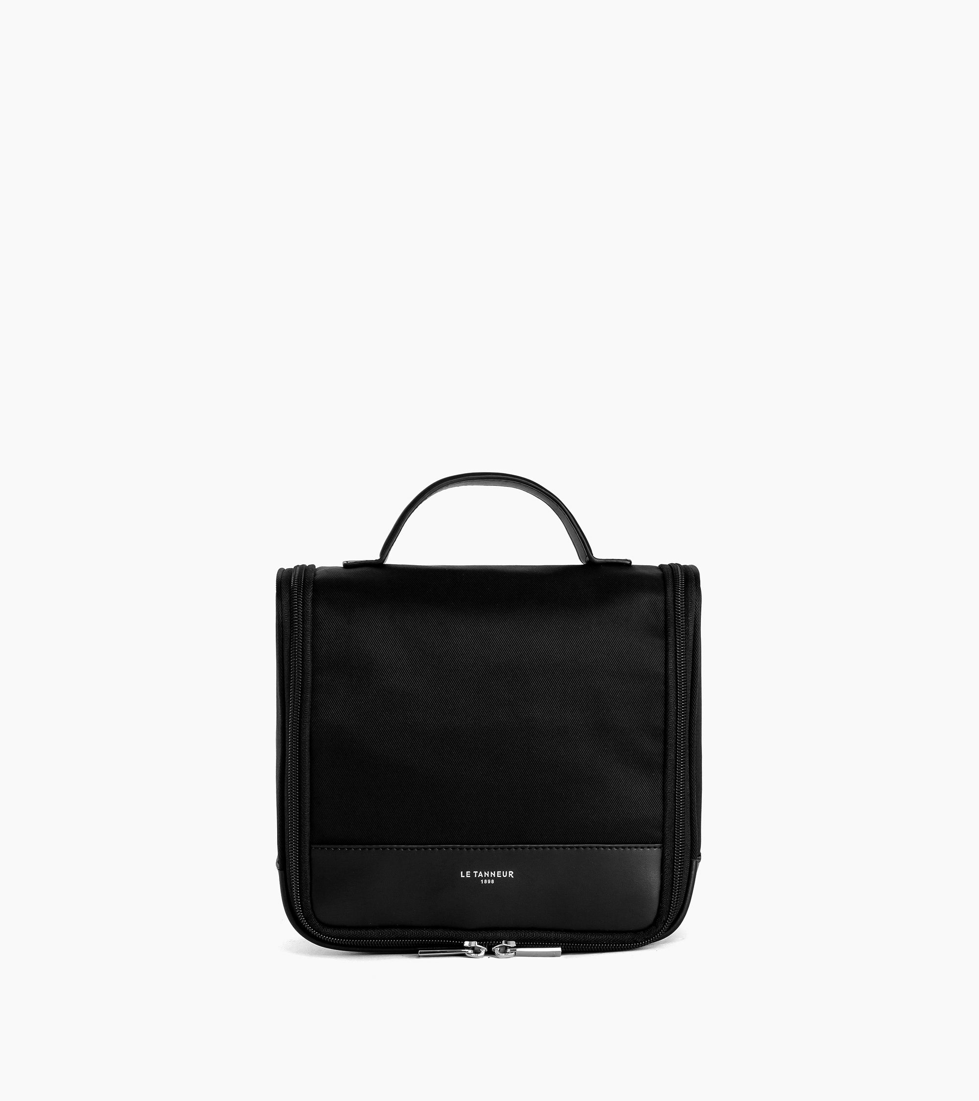 Trousse de toilette dépliante en toile polyamide avec renfort cuir marqué ton sur ton. Ce modèle zippé comporte des tirettes piquées en T, signature de la Maison.Toile enduite et cuir de vachette lisse. Doublure textile3 poches zippées, 4 passants élastiqués et 1 crochet d'attache. 1 poche plate arrière.Accessoires métalliques finition argent.Largeur : 24 cm x Hauteur : 22 cm x Profondeur : 8 cm