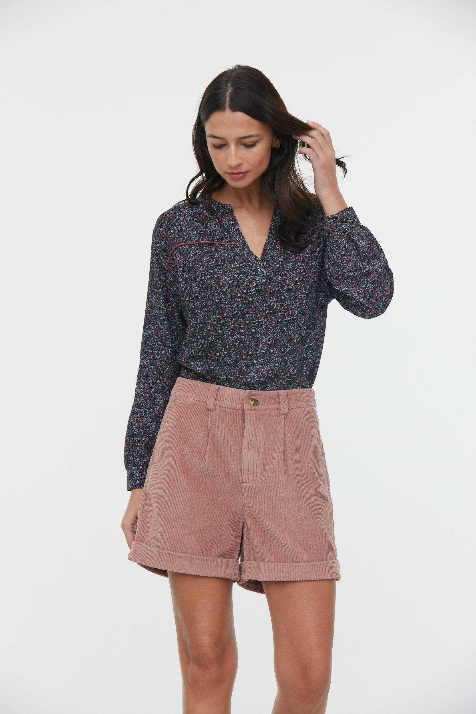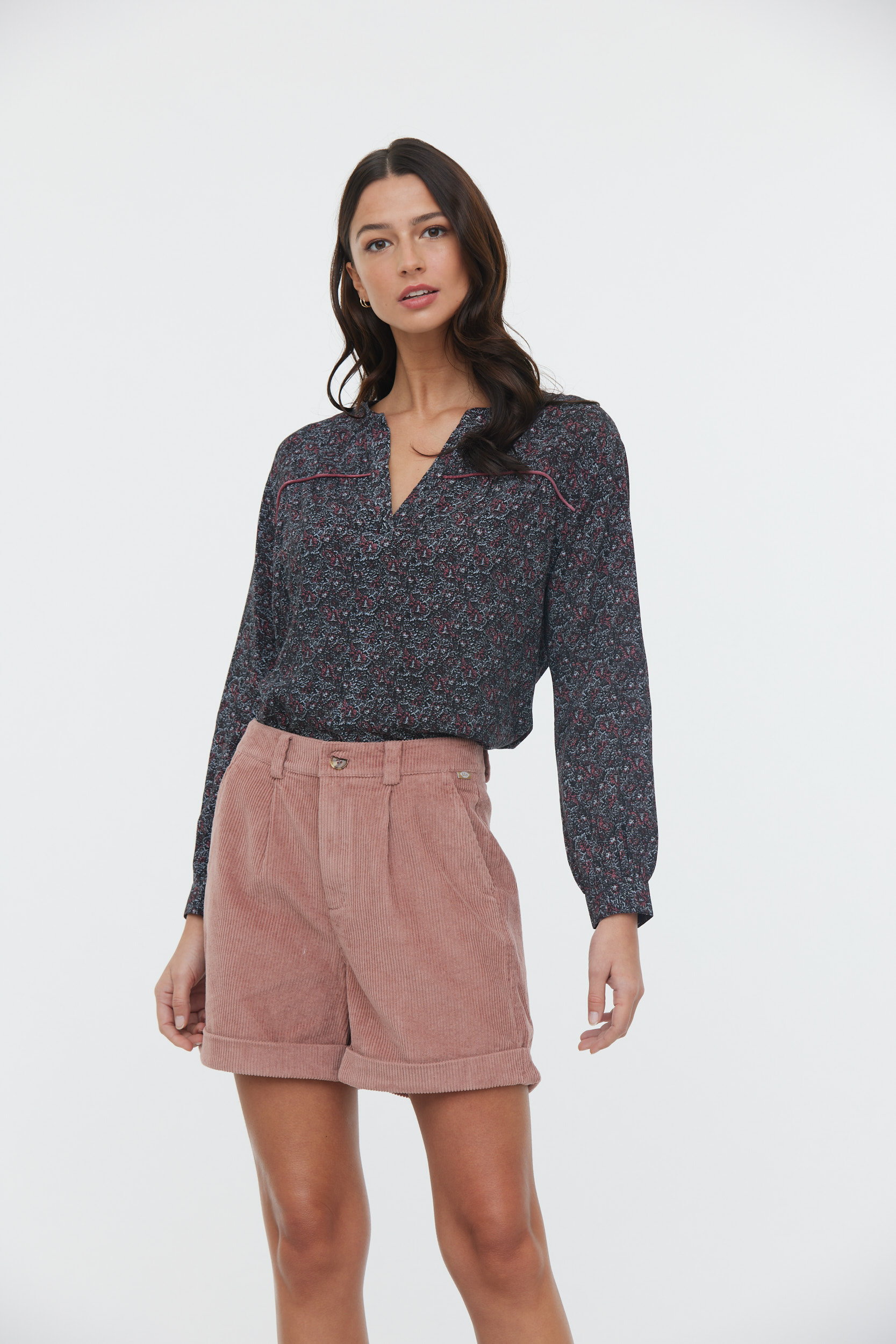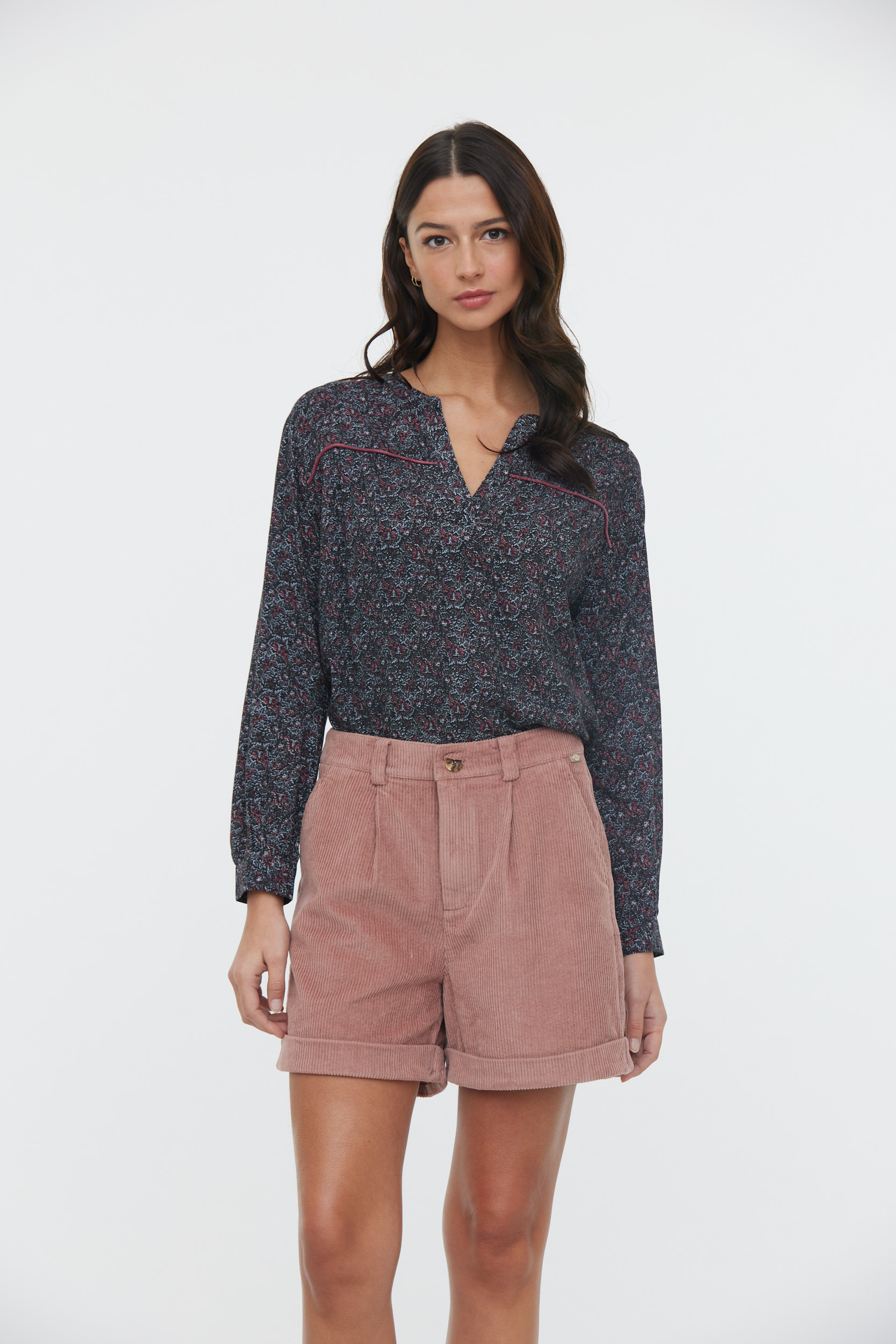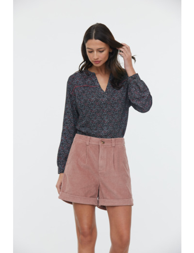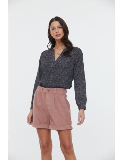 Blouse En Viscose Imprimé Micro Fleur Manches 3/4 Et Detail Piping En Velours