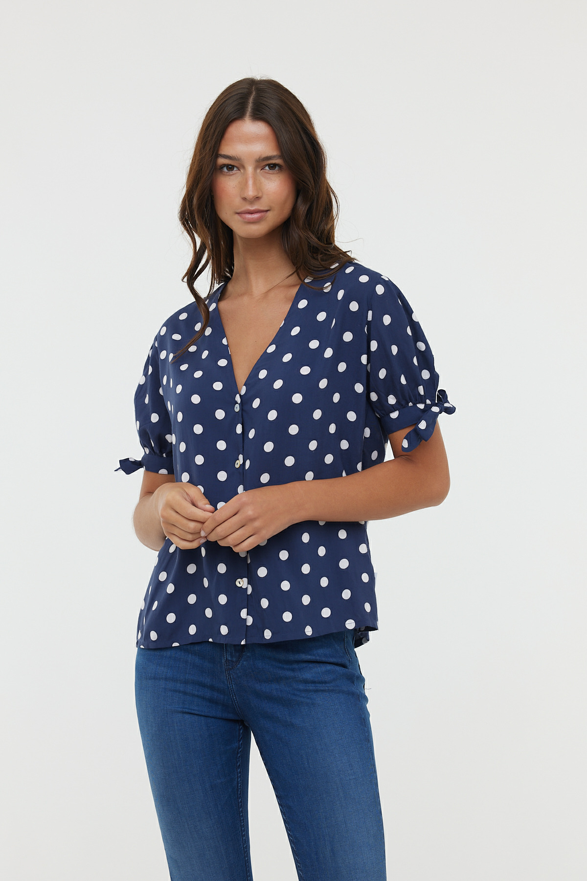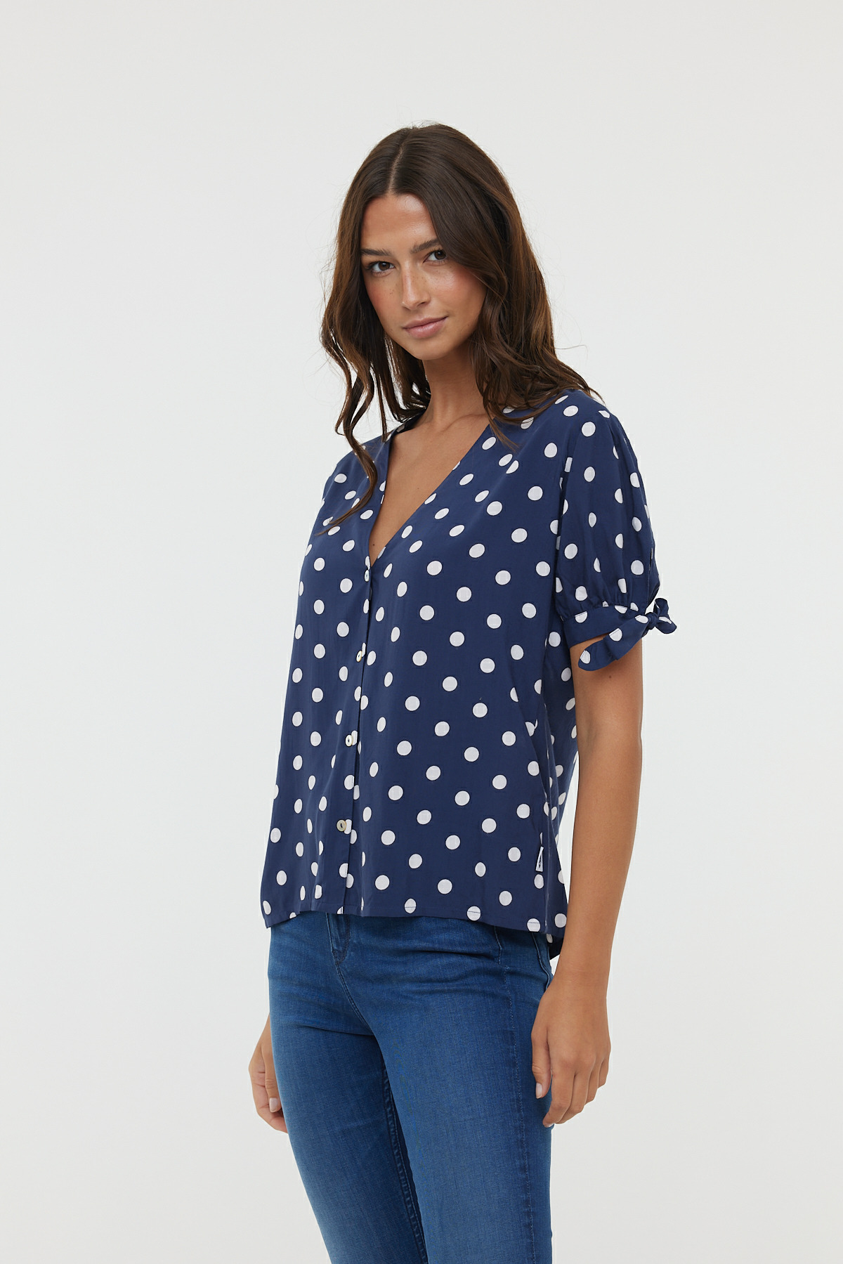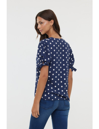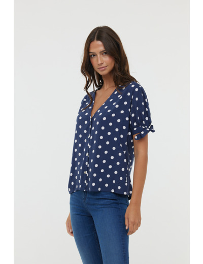 Chemise En Viscose, Manches Courtes Bouffantes Nouées En Bas De Manche, Col V Et Fermeture Boutonnée, Imprimé « Pois »
