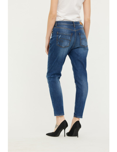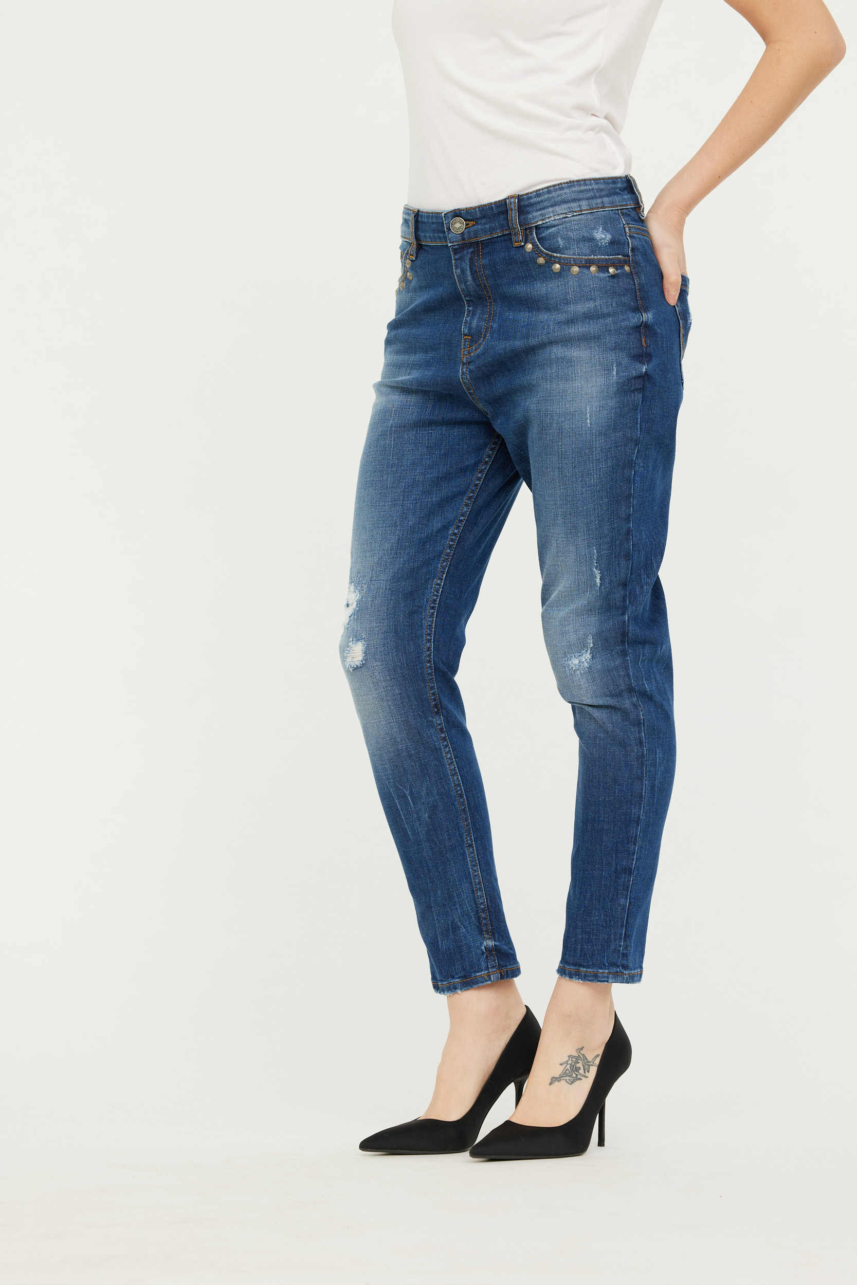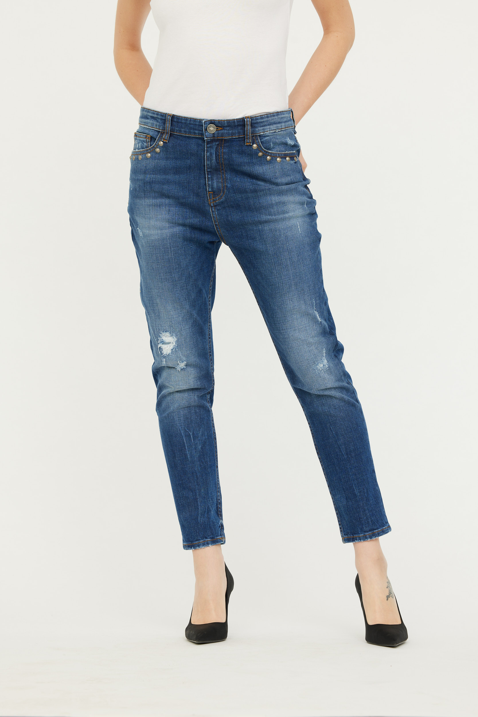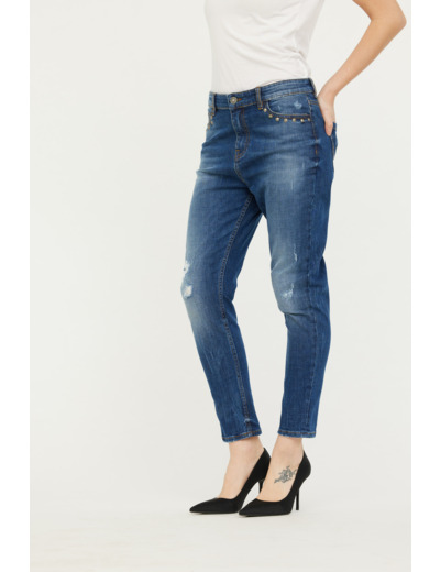 Denim Destroy Boyfriend Fit, Coupe Ample Et Jambes Resserrées, Taille Medium Basse, Détail Clous Poches Devant