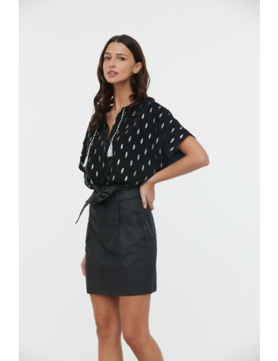 Jupe Paperbag En Denim Enduit,Ceinturé Taille Et Plis Devant