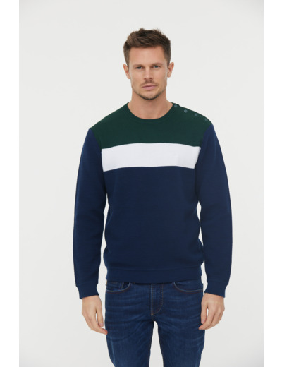 Pull Col Rond Maille Fantaisie «Color Block» Avec Boutonnage Pression Épaule
