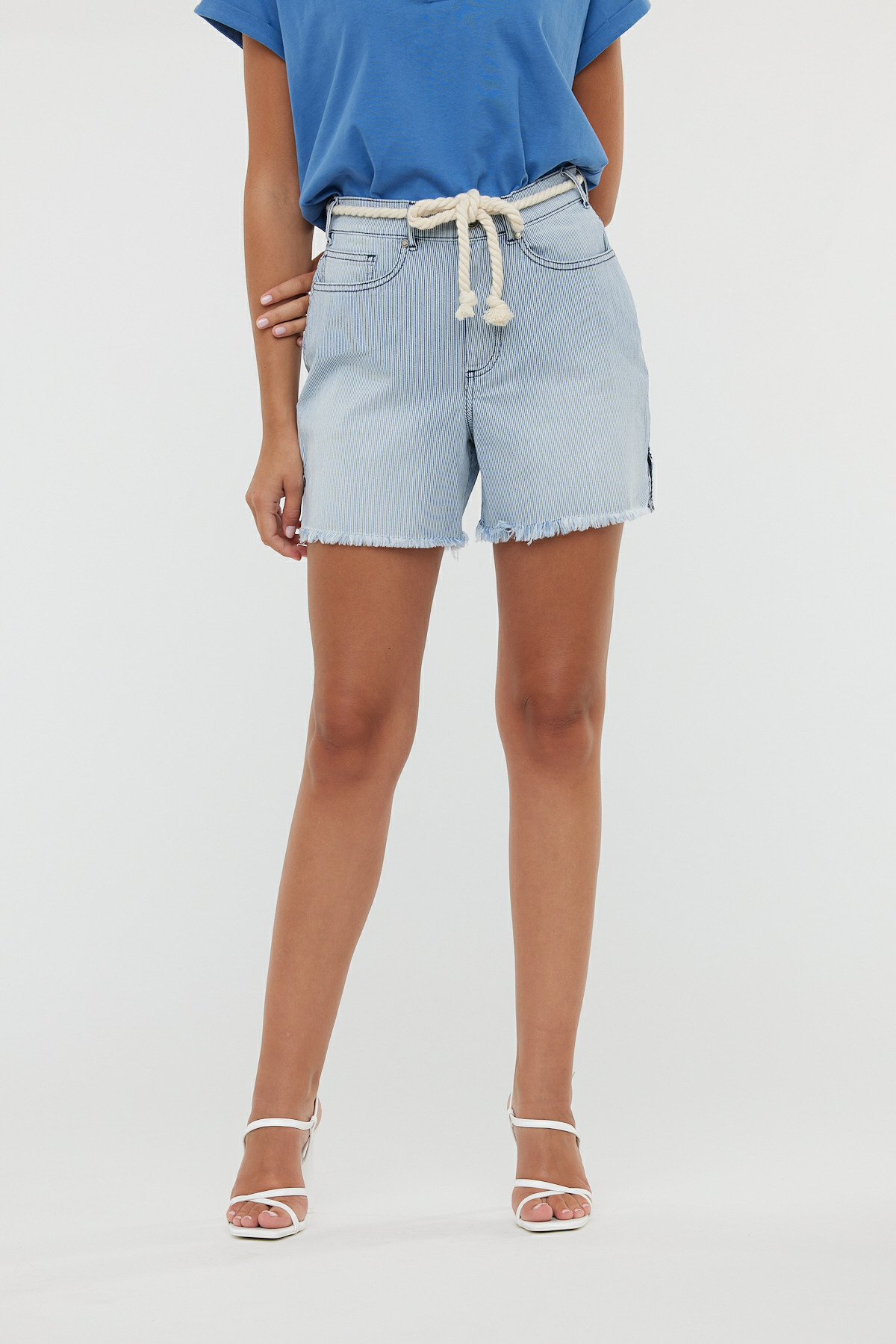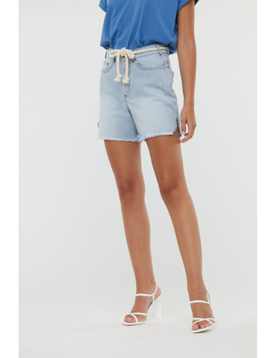Short En Tissu Rayé Oshkosh, Boyfriend Fit, Taille Haute, Bas De Jambe Bord Franc, Fentes Sur Les Jambes Côté, Avec Ceinture En Coton Amovible