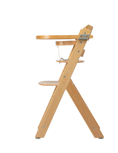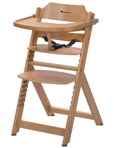 Dimensions et matériaux : chaise en bois naturel, adaptée aux enfants de 6 mois à 10 ans. Ceinture de sécurité 3 points, plateau amovible, pare-chocs démontable. Livrée sans coussin.