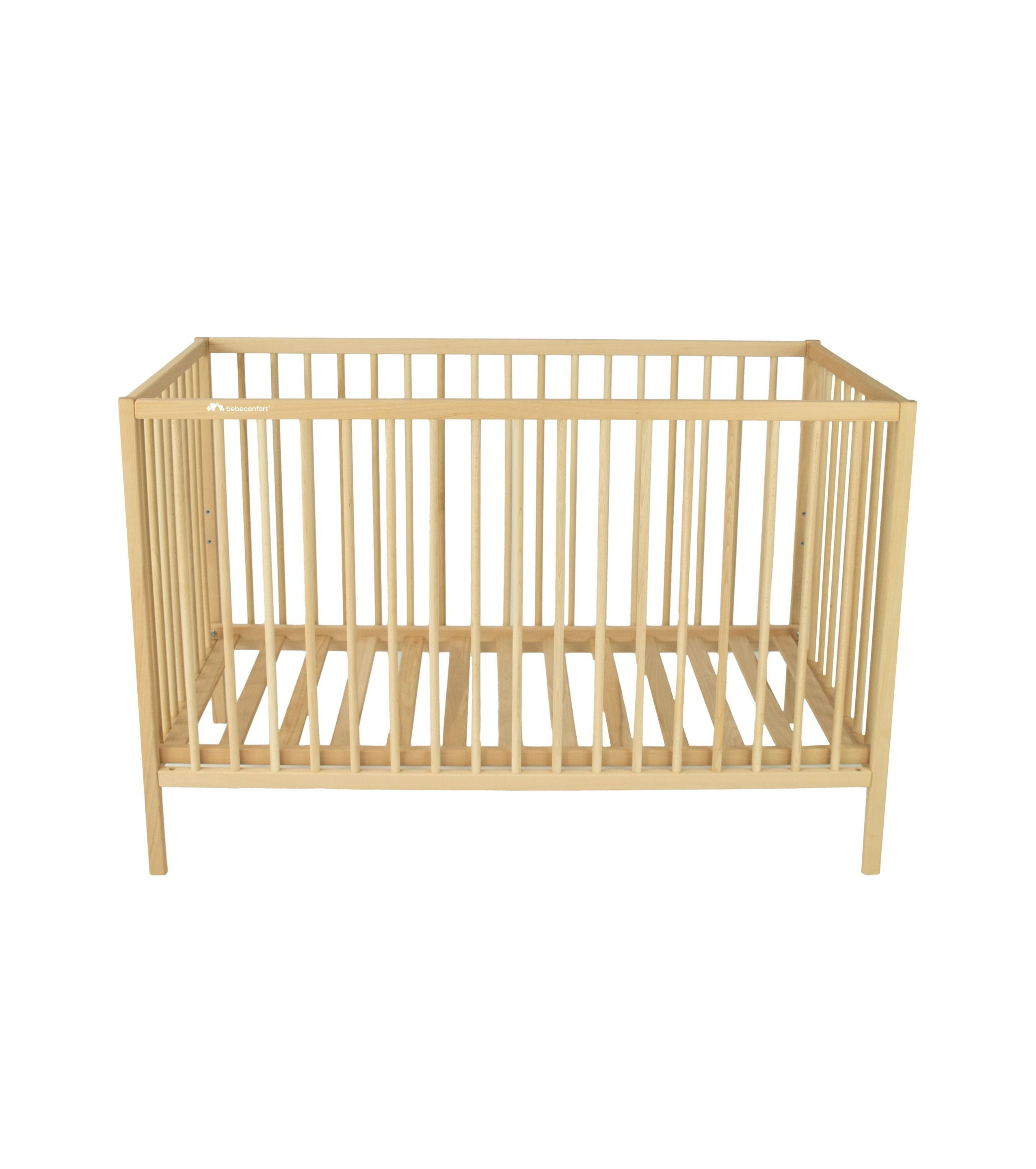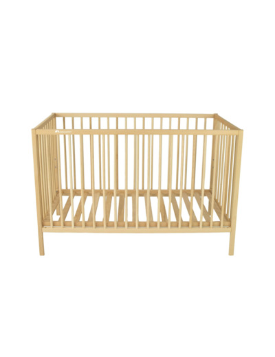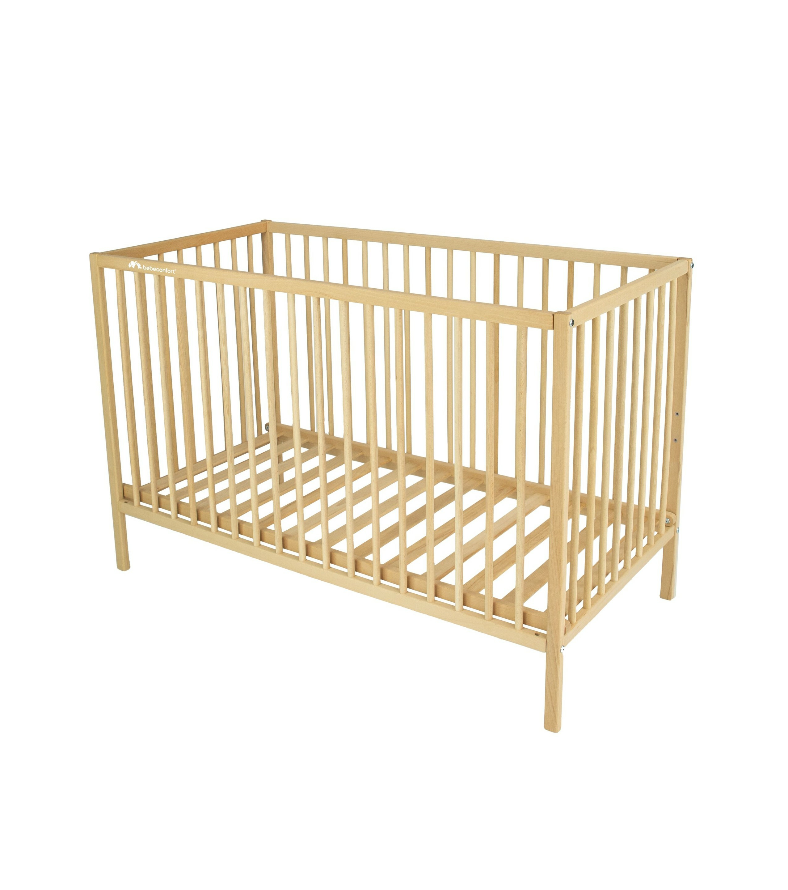 Dimensions 60x120 cm, bois naturel certifié FSC®, trois positions de sommier réglables en hauteur pour un usage prolongé. Convient dès la naissance jusqu’à 3 ans.