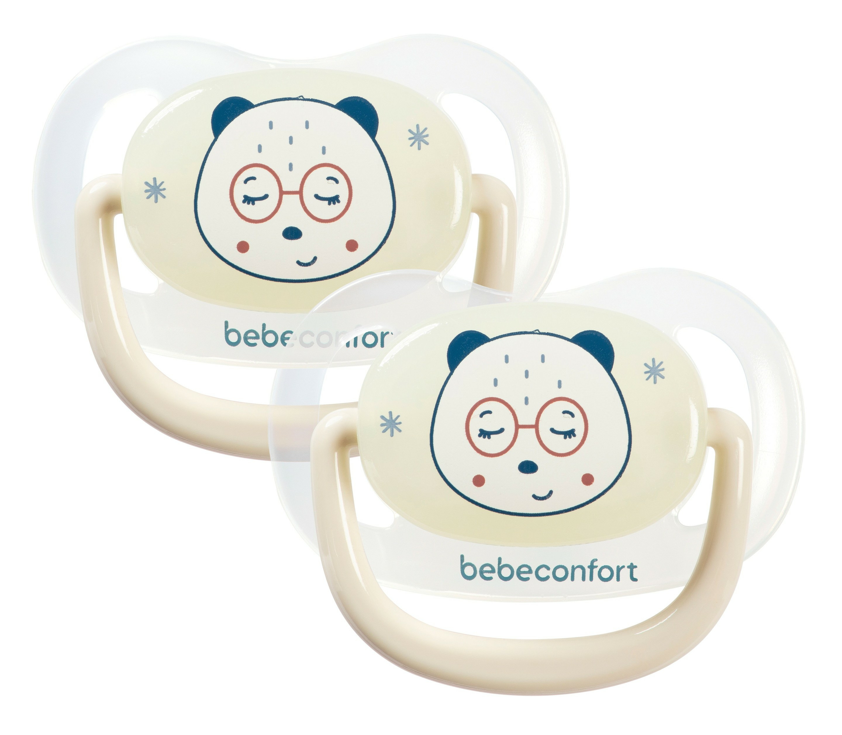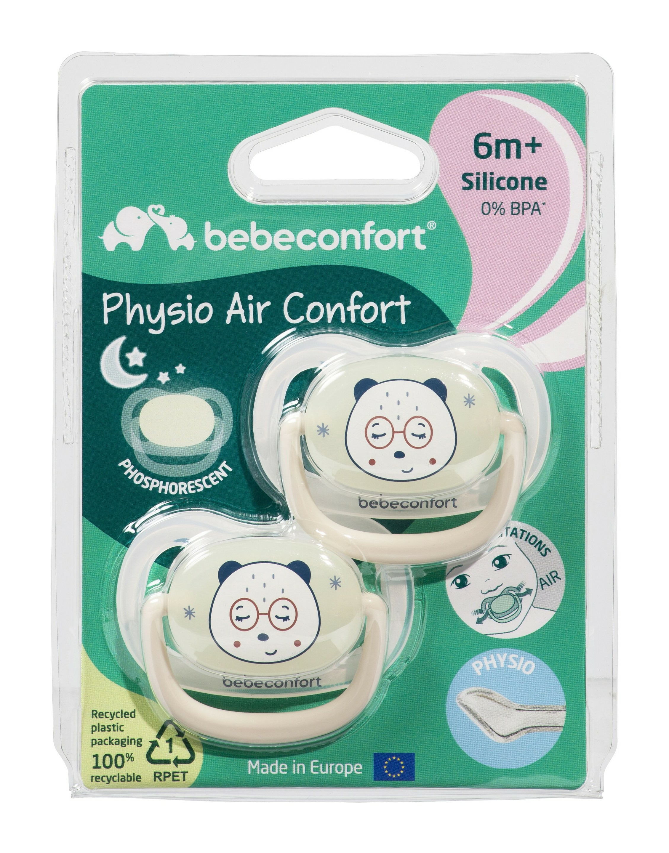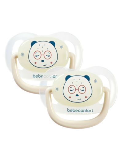 Lot de 2 sucettes physiologiques air confort, adaptées dès 6 mois. Téterelle en silicone souple, forme physiologique proche du sein. Matière phosphorescente pour une visibilité nocturne. Marque Bebéconfort, gage de qualité et sécurité.