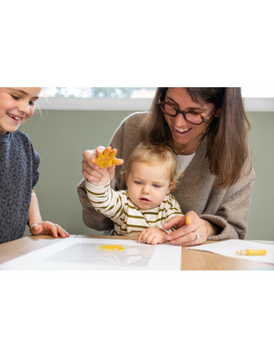 Comment utiliser le kit ? Appliquez la peinture sur la main de l’enfant ou d’un membre de la famille, pressez sur la surface transparente, puis laissez sécher avant d’ajouter une nouvelle couche.