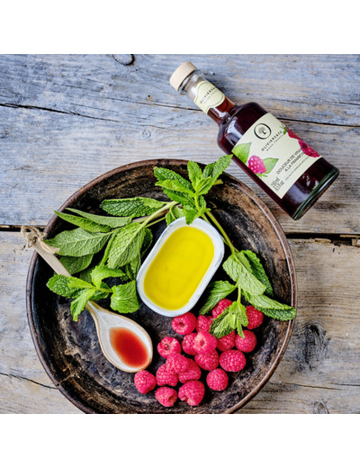 Condiment à la framboise, contenu 250 ml. Origine Portugal. Ingrédients : vinaigre d’alcool 70%, framboise 20%, sucre. À conserver à l’abri de la chaleur et de la lumière.