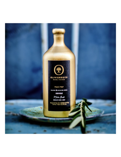 Huile d'olive vierge extra Dievole, 500 ml. Origine : Italie, région du Chianti Classico. Ingrédients : olives Maurino (50%), Leccio del Corno (30%), Frantoio (10%), Leccino (10%). Conservation : à l’abri de la chaleur et de la lumière. Date de récolte : novembre 2024.
