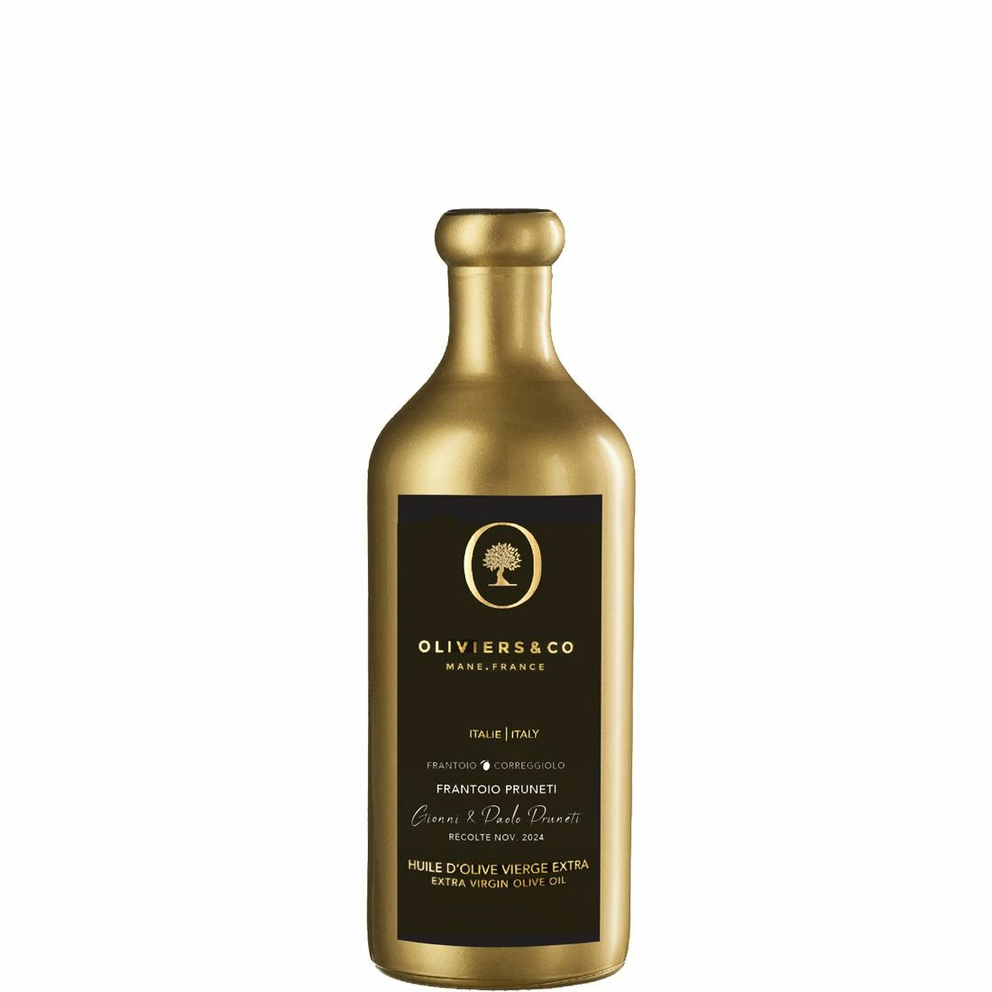 Huile d’olive vierge extra biologique, récolte novembre 2024. Origine Italie, domaine Pruneti. Composition : 85% Frantoio, 10% Leccino, 5% autres variétés. Conservation : à l’abri de la chaleur et de la lumière. Puissance gustative intense, profil végétal avec des notes aromatiques d’artichaut et de pomme verte. Taux d’acidité : 0,17%. Taux de polyphénols à l’embouteillage : 306 mg/kg.