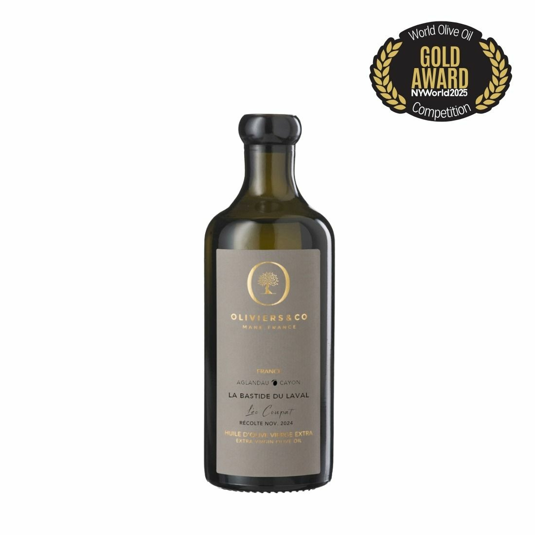 Huile d’olive Vierge Extra Bastide du Laval, 250 ml. Origine France, production Léo Coupat, récolte novembre 2024. Assemblage d’olives Aglandau (80%), Bouteillan, Salonenque, Picholine et Cayon. Conservation à l’abri de la chaleur et de la lumière.