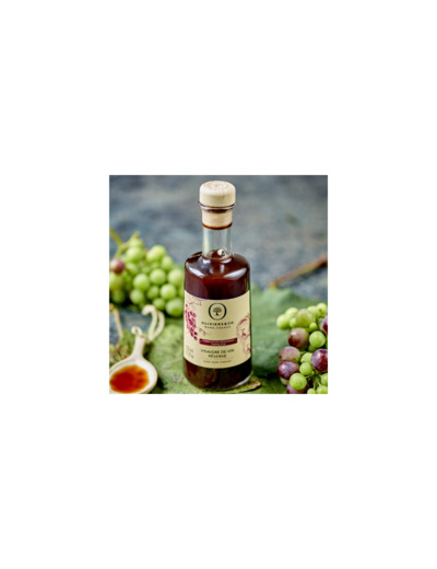 Vinaigre de vin rouge vieilli 24 mois en fûts de chêne, châtaignier et merisier. Acidité 6%. Contenance 250 ml. Ingrédients : vinaigre de vin rouge 85% (sulfites), moût de raisin 15% (sulfites). Origine France. Conserver dans un endroit frais et sec.
