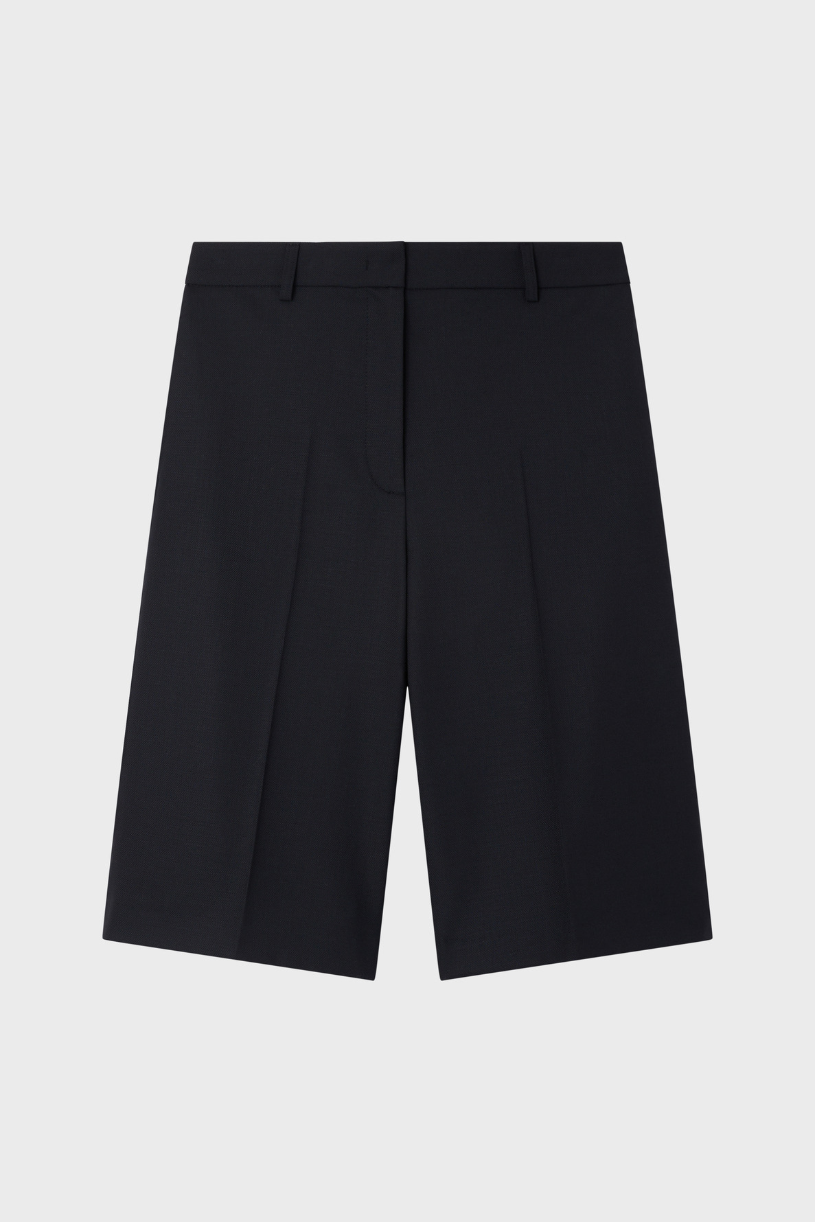 Ce bermuda garantit un maintien optimal grâce à sa ceinture montée à passants et sa fermeture sécurisée avec zip sous patte, agrafe et bouton caché. La coupe droite assure une aisance de mouvement sans sacrifier la structure, tandis que la matière en laine mélangée assure durabilité et confort.