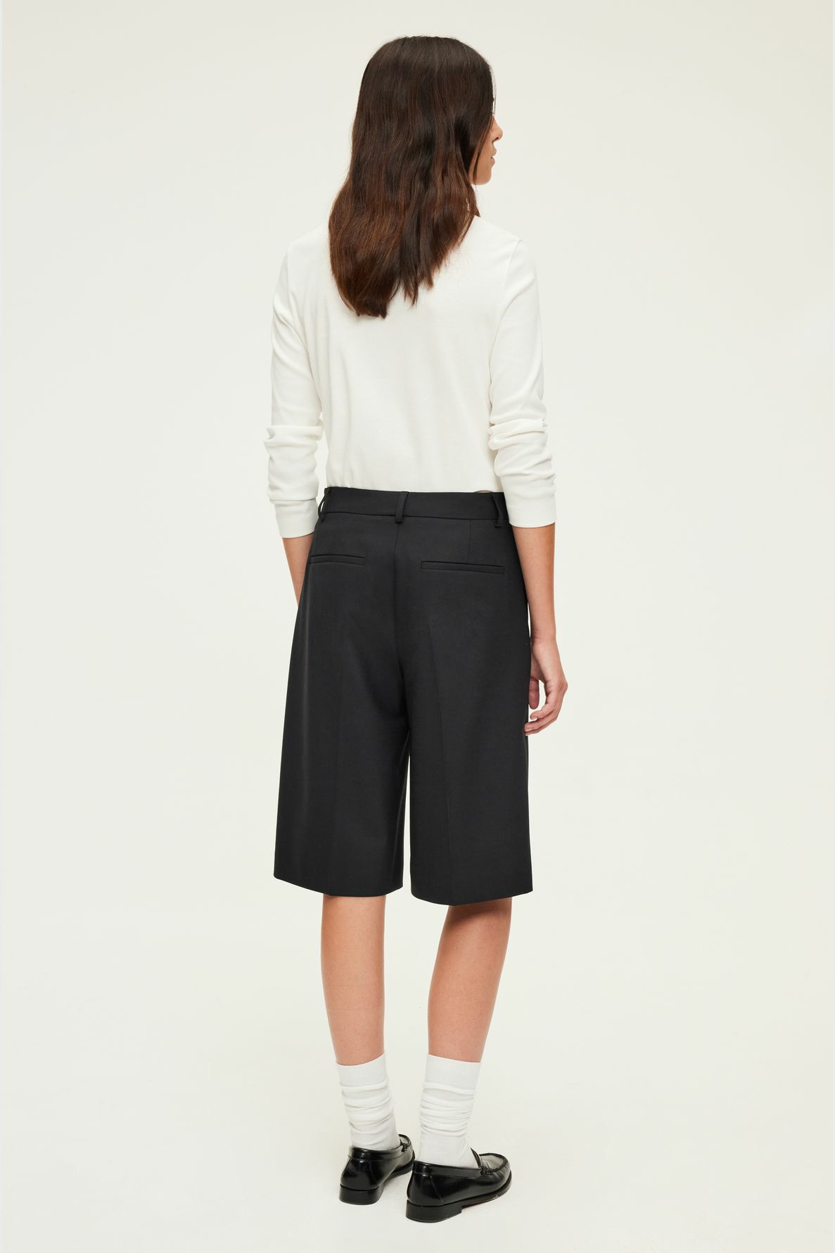 Laine mélangée unie, bermuda long avec pli, fermeture zip sous patte, agrafe et bouton cachés à la taille, coupe droite, poches italiennes devant, poches plates passepoilées au dos, ceinture montée à passants, effet petit nid d’abeille. La mannequin mesure 180 cm et porte une taille 38.